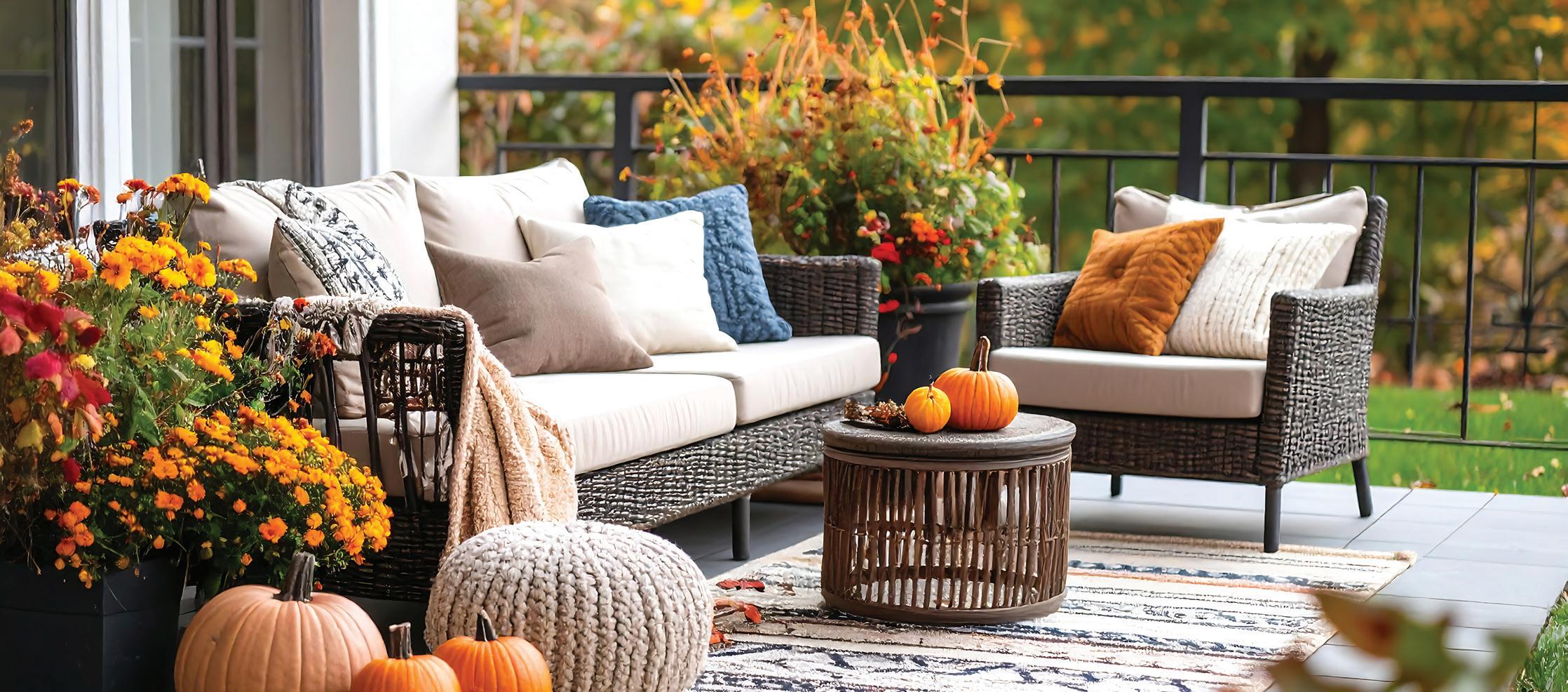 Larger pots create more impact and help plants hold moisture longer, while a collection of smaller planters can add charm with variety. Complete the arrangement with gourds, lanterns or copper details for an inviting fall finish.