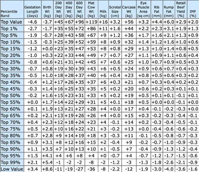 Use this table as a guide to compare individual animals with the current genetic level of the breed