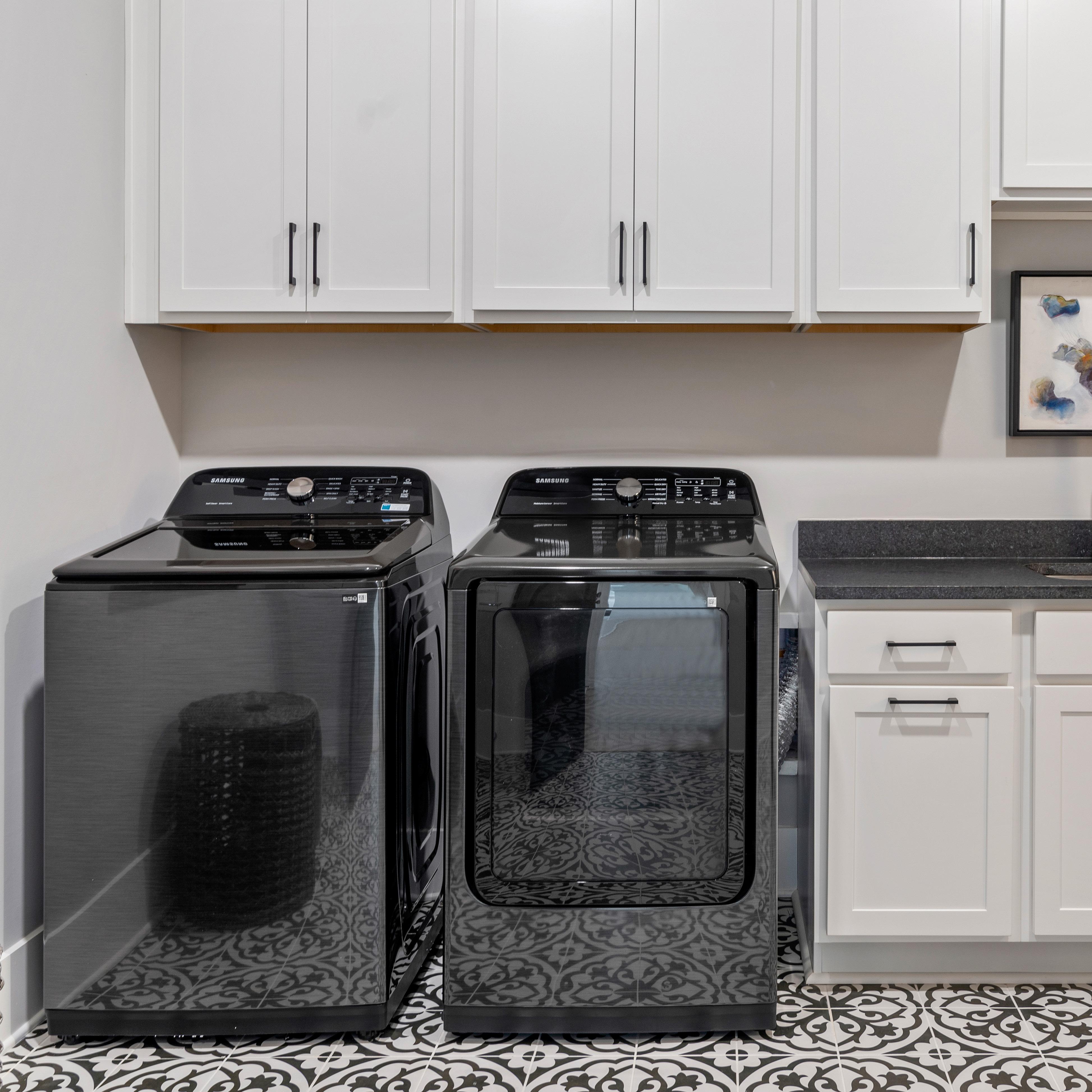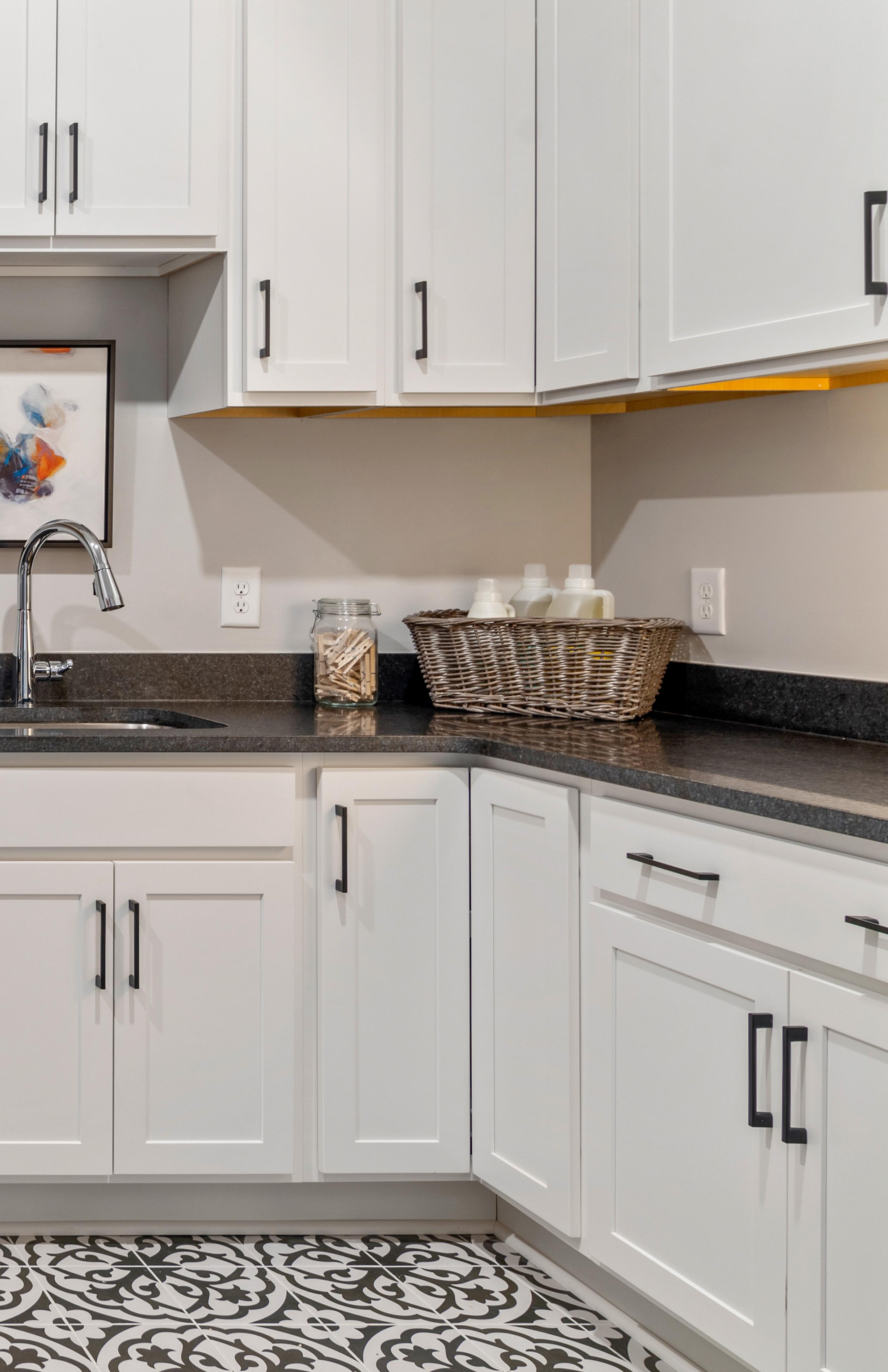 Add two 36” tall Perpetua™ wall cabinets with Madison Knobs in satin nickel over washer & dryer. *With soft close doors. Deletes Wire Shelving