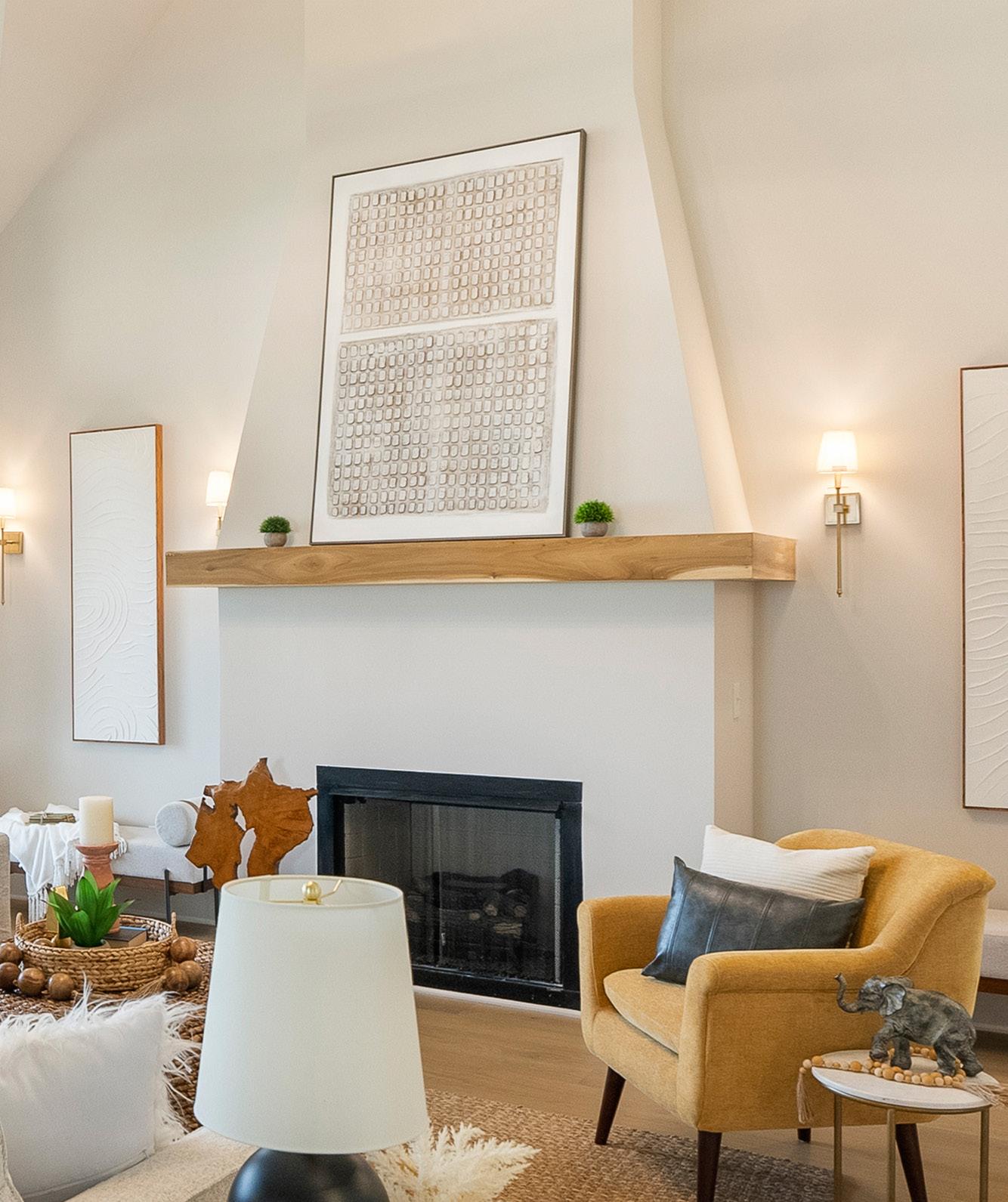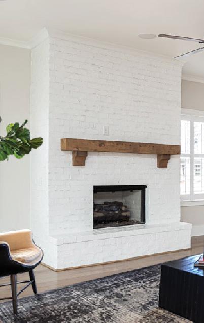 FARMHOUSE FIREPLACE with PAINTED BRICK with cedar mantel & corbels