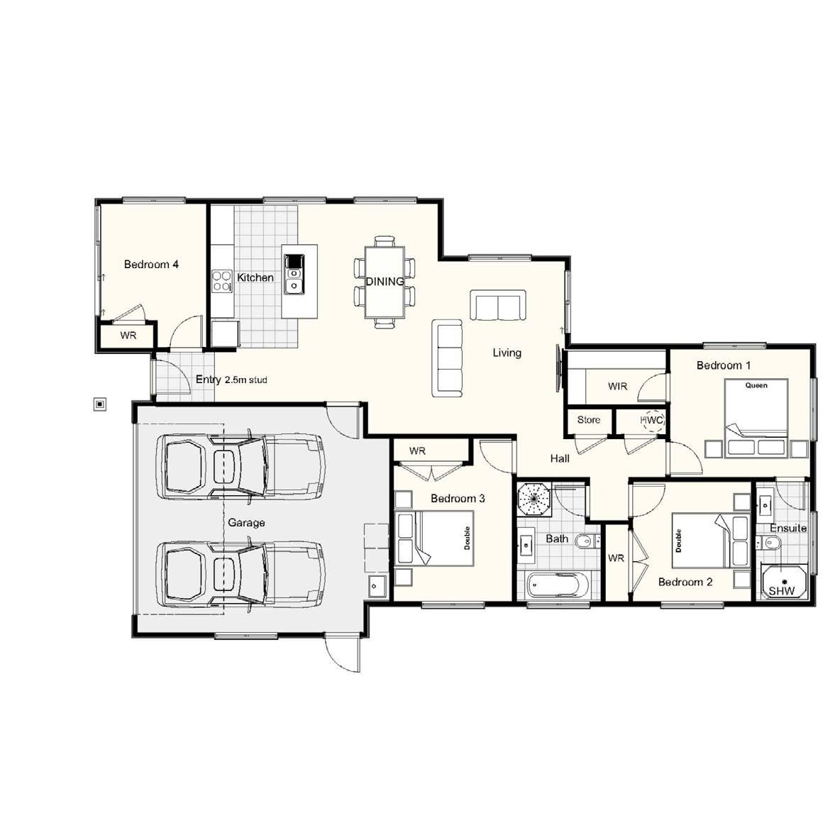 Our Fernbird plan offers an ideal family home or investment build. You will find a bedroom ideal for guests or teenagers at the entrance, with the remaining three bedrooms tucked away at the back of the home.