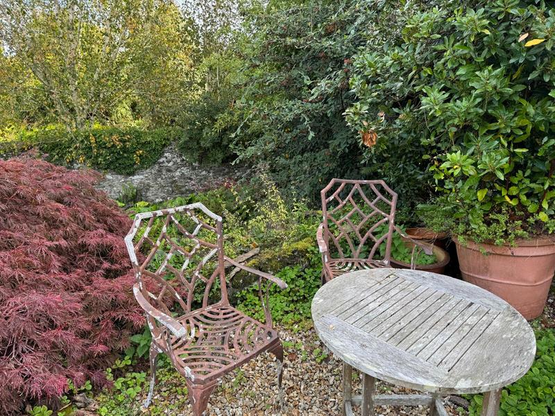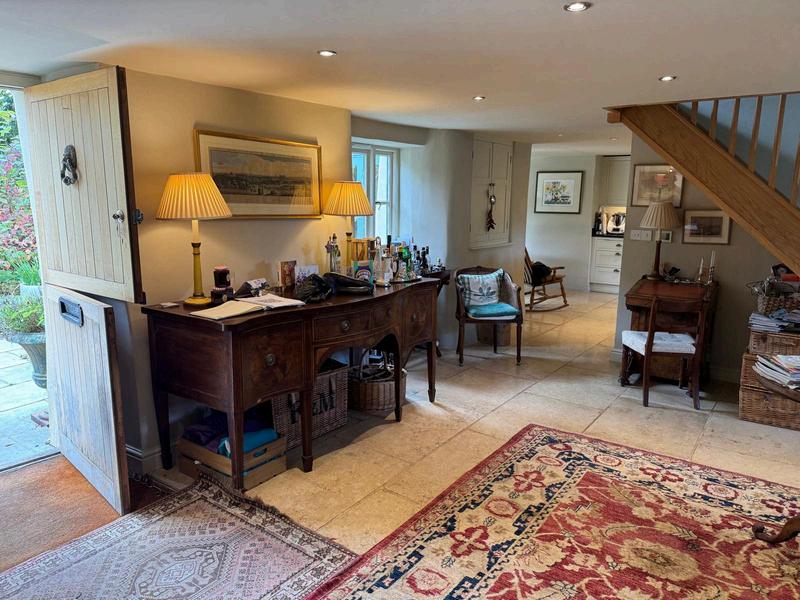 The drawing room is a wonderfully inviting space, with oak flooring and a distinctive curved window with seating below overlooking the water Natural light pours in here, framing the ever-changing waterside views. At its heart stands another striking feature - a stone inglenook fireplace with a huge lintel beam and wood-burning stove, anchoring the room with historic presence Exposed stonework and the slightly irregular lines of the chimney breast hint at the farmhouse’s medieval origins, while traditional details such as antique furniture and rich rugs make the space feel both elegant and homely. Steps lead down to a study with a door opening directly onto the garden.
