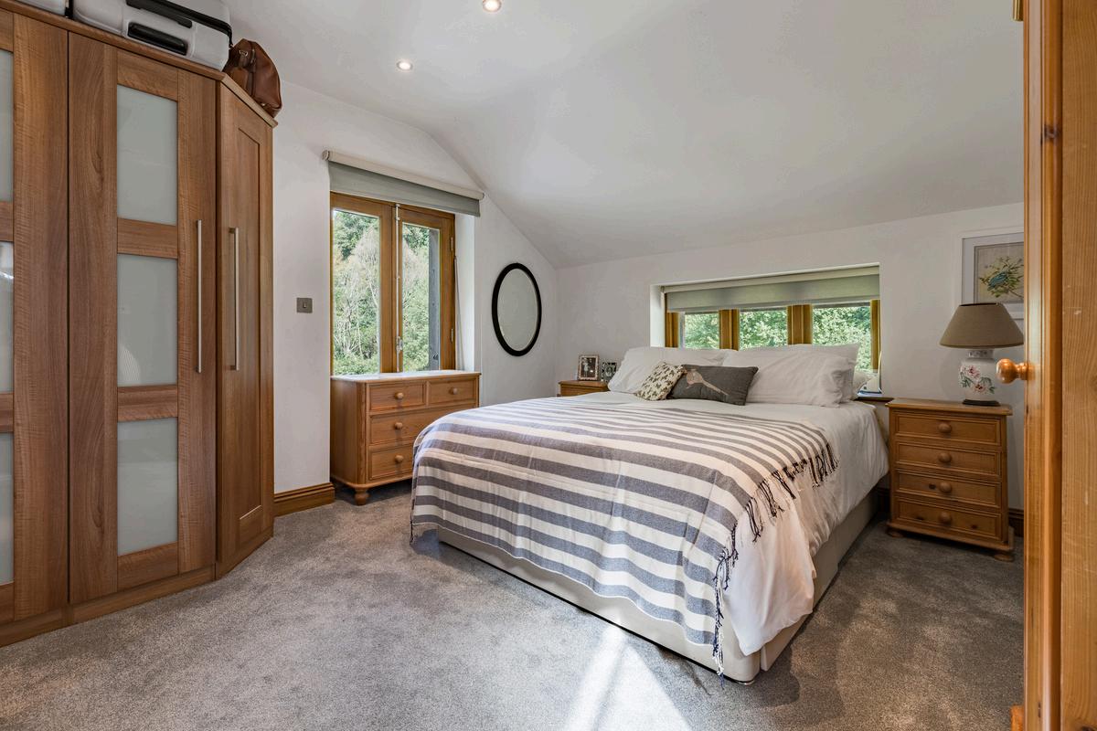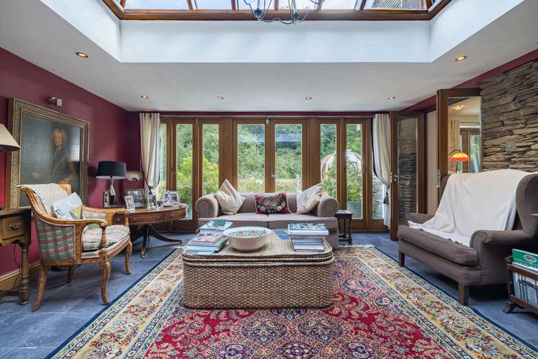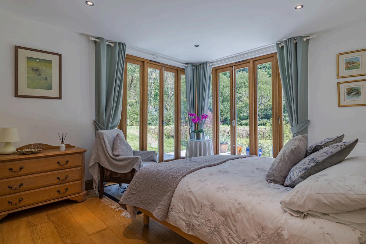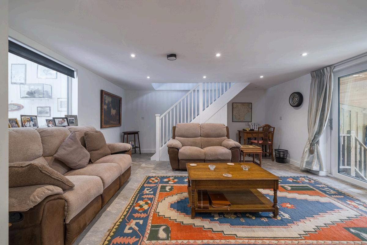 Separate generously proportioned, secondary accommodation spans two floors, featuring an open-plan kitchen, dining, and sitting area with sliding doors that open to a veranda with a hot tub This space includes a double bedroom with a dressing room and an en-suite shower room