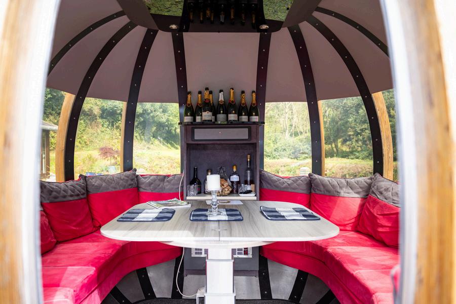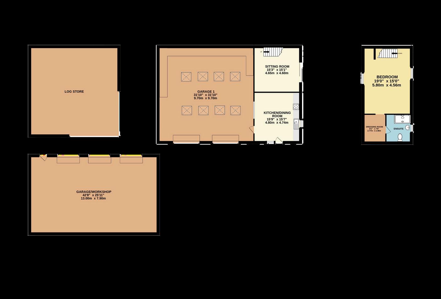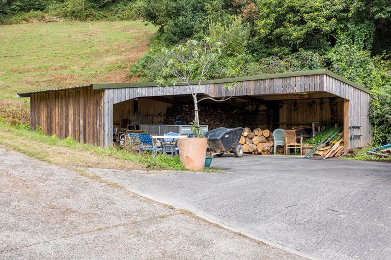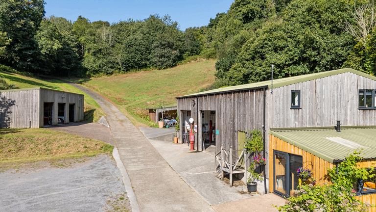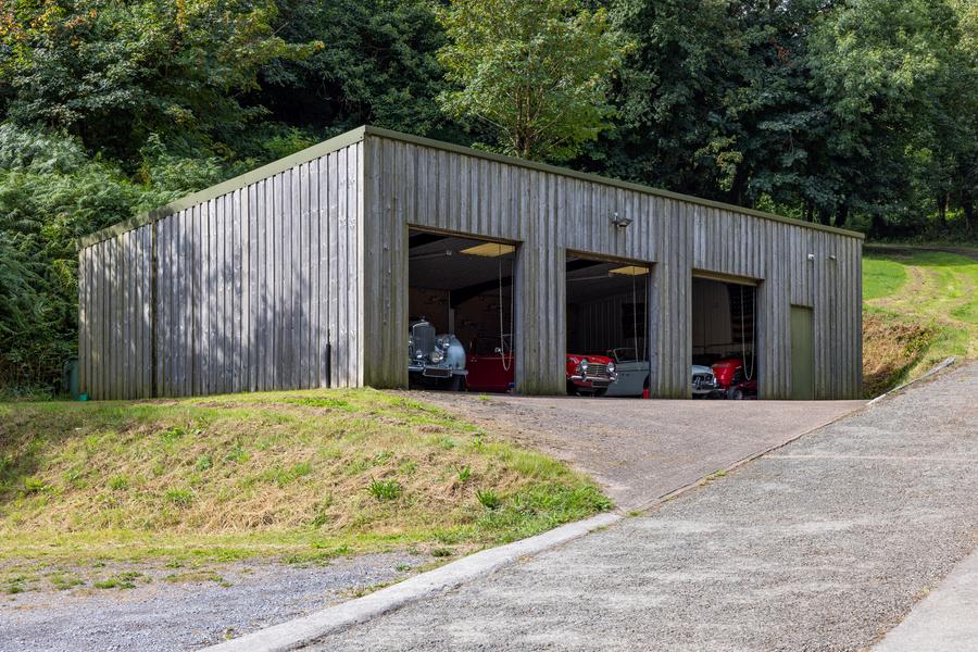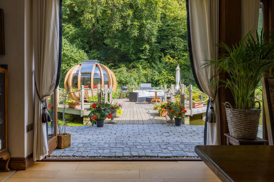 Separate generously proportioned, secondary accommodation spans two floors, featuring an open-plan kitchen, dining, and sitting area with sliding doors that open to a veranda with a hot tub This space includes a double bedroom with a dressing room and an en-suite shower room