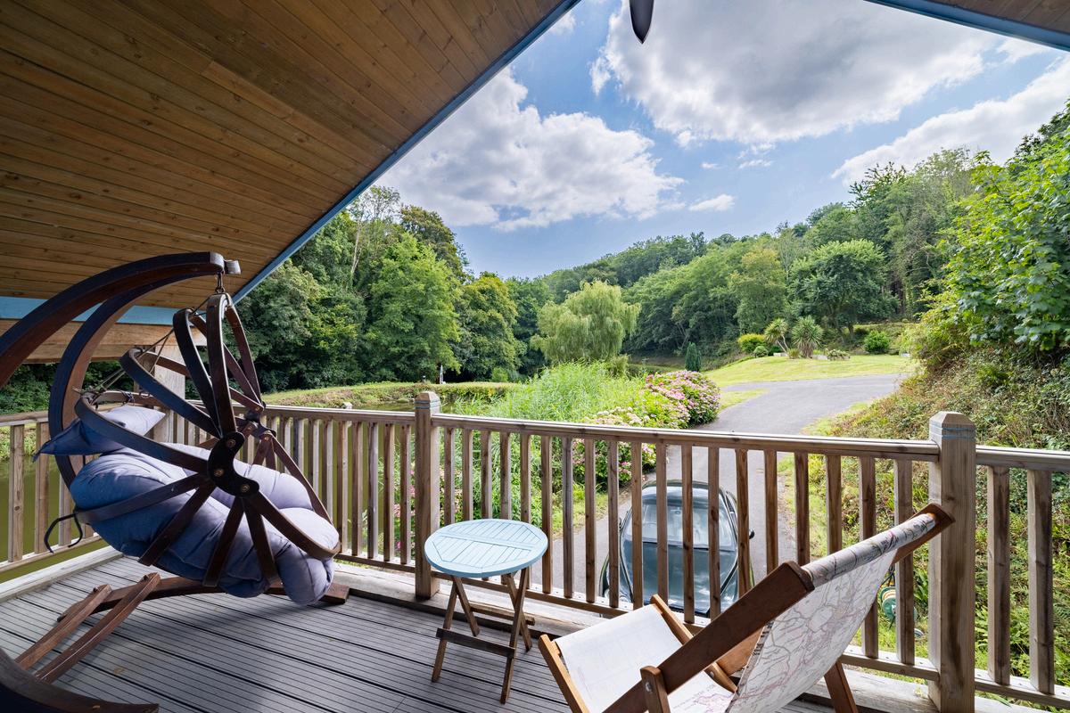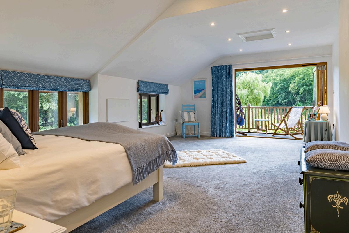 Bi-fold doors lead to a south-facing balcony with breathtaking views of the lakes and surrounding woodlands