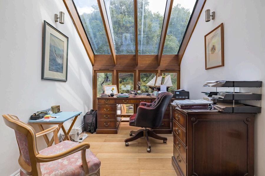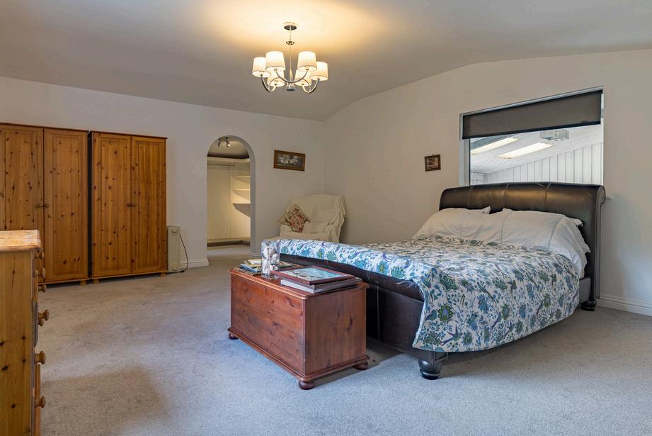 A staircase leads to a glazed galleried landing, which opens to a principal suite that includes a walk-in dressing room and an en-suite bathroom.