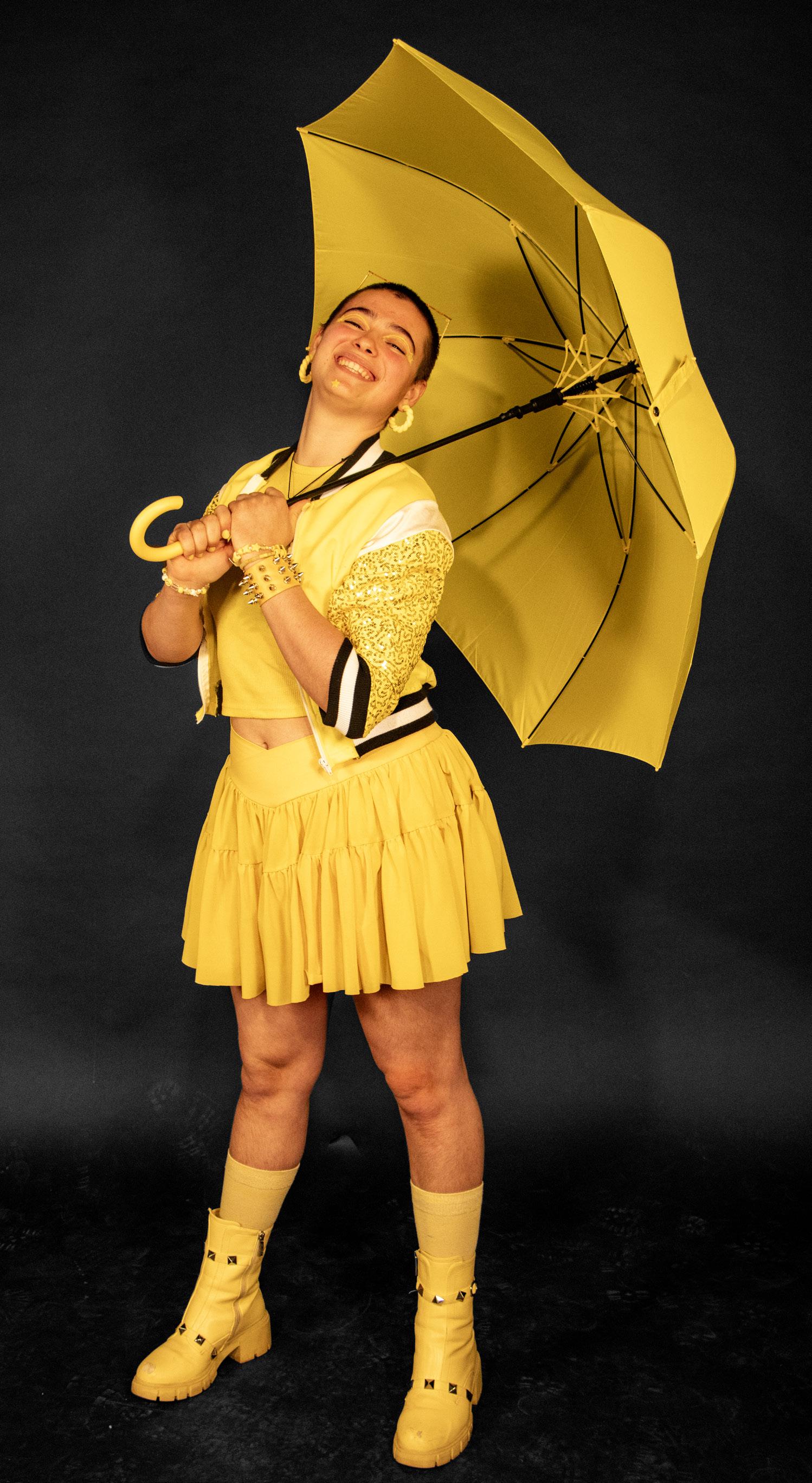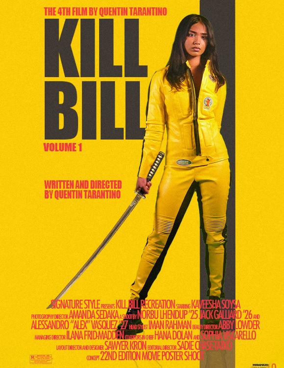 Kaveesha Soysa ’26 had never seen Kill Bill in its entirety, but she understood the essence of Uma Thurman’s character. She was excited to recreate a poster from the 2000s because she feels nostalgia from movies of the era. For the shoot, she purchased an exact replica of the yellow jumpsuit that Thurman wears and branded a fake sword. The outfit and the character she stepped into both made her feel like a “badass.”