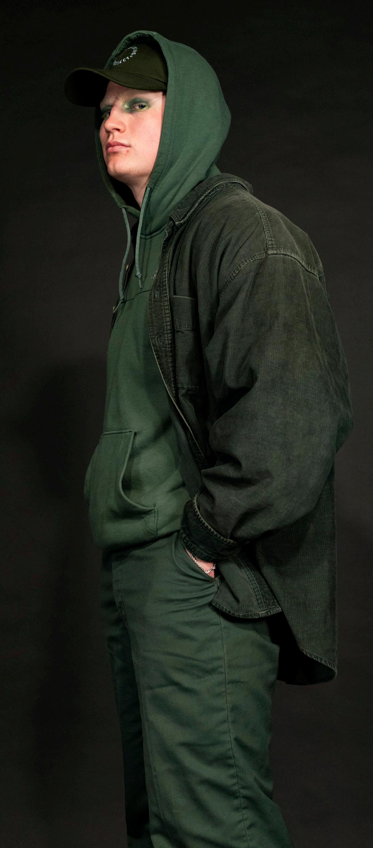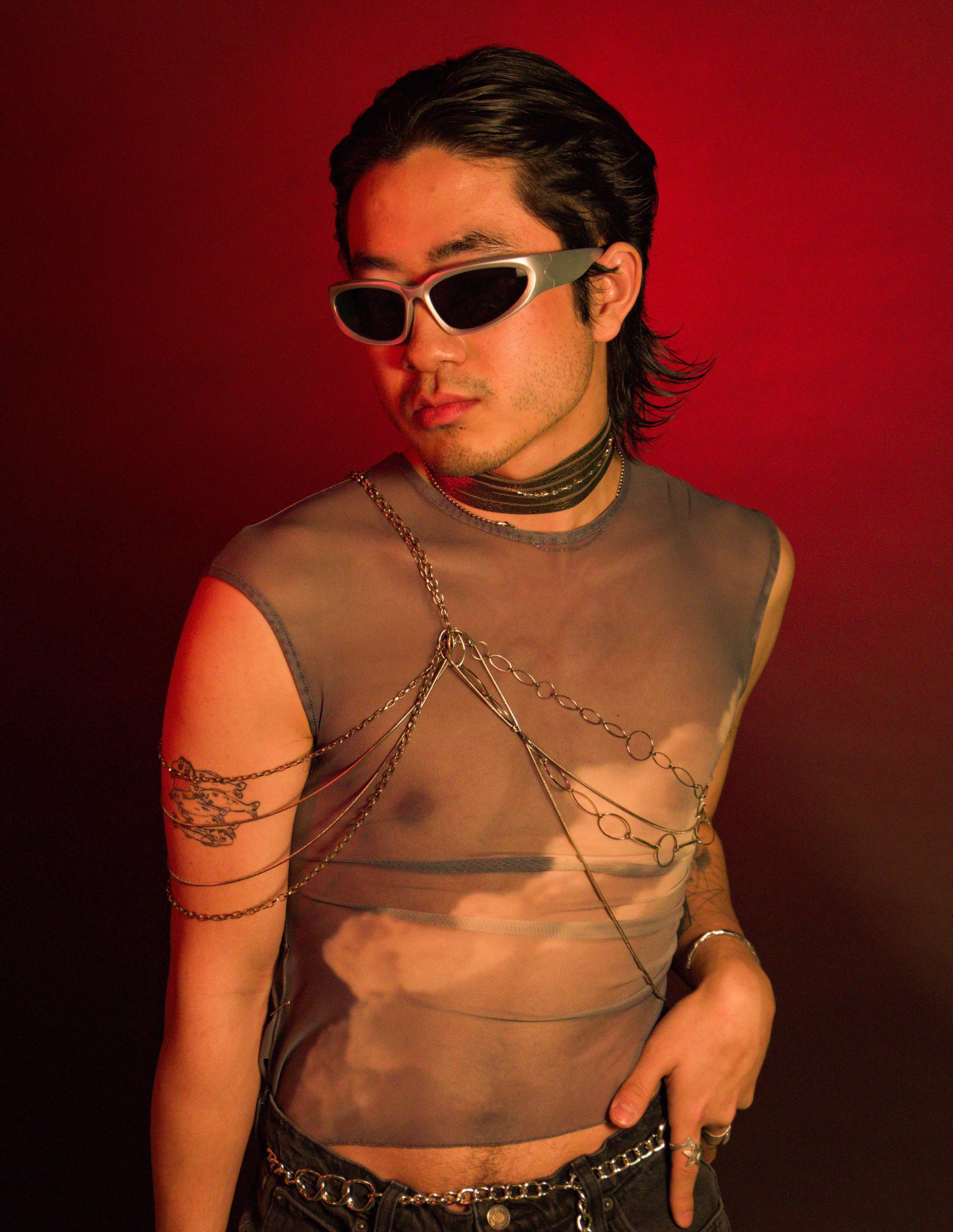 the 2010s. Within fashion, that utopia is represented through neutral, earthy tones, such as the warm brown of Shen’s shirt. Reminiscent of the metal pieces found in the costuming of both Dune and Mad Max, Shen was draped in silver chains across his back, biceps, and chest. The cool tone of Shen’s eye makeup, as well as thick, silver bangles combined aspects of constricting machinery with the freedom of nature.