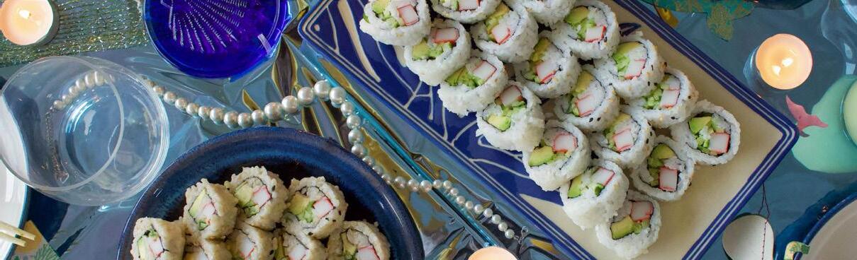 The aesthetic of this shoot also plays into escapism. Mermaid-core is an escapist fashion trend, rooted in childhood nostalgia and mythical creatures. This aesthetic allows individuals to feel beautiful in an unconventional and magical way. The location of a cocktail party also lends itself to escapism through the recreation of a seemingly simple space to an underwater wonderland. The photoshoot evokes that feeling you have after spending the day at the beach, when you make your way inside to shower and get dressed for a nice dinner. The warmth radiating from your burnt skin and feeling oh-sopretty when you look in the mirror is a sensation almost impossible to recreate. Thousands of TikTok users create and repost videos describing this feeling and wishing for summer to come. With the mermaid cocktail party shoot, we strive to combine all things mermaids with the best summertime feelings for an incredible escapist experience. After a long day of swimming, our mermaid-ified models share drinks, cakes, and sushi under aquatic lighting. From fashion, to set, to lighting, to makeup, this shoot leans entirely into the escapist elements of mermaid-core.
