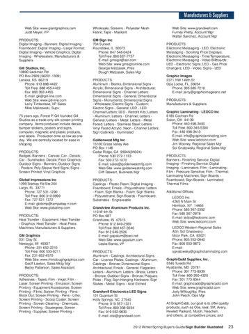 Wholesale; Screens - Polyester Mesh Fabric; Tape - Maskant GM Sign Inc 704 Sunset Roundlake, IL 60073 Phone: 847 546-0424 Toll Free: 800 637-7757 E-mail: gmsign@aol.com Web Site: www.gmsignonline.com George Matzasek, Pres Dough Matzasek, Sales Mgr PRODUCTS: Aluminum - Blanks; Dimensional Signs Acrylic; Dimensional Signs - Architectural; Dimensional Signs - Channel Letters; Dimensional Signs - General; Dimensional Signs - Monuments; Dimensional Signs - Wholesale; Electric Signs - Custom; Electric Signs - General; LED - LED Channel Letters; LED - Retrofit Kits; Letters - Aluminum; Letters - Channel; Letters General; Letters - Metal; Letters - Metal Faced; Letters - Stainless Steel; Letters Vinyl Faced Acrylic; Neon - Channel Letters; Sign Cabinets - Illuminated Goldenwest Mfg Inc 13100 Grass Valley Ave PO Box 1148 Cedar Ridge, CA 95945(95924) Phone: 530 272-1133 Fax: 530 272-1070 E-mail: sales@goldenwestmfg.com Web Site: www.goldenwestmfg.com Cliff Stewart, Business Mgr PRODUCTS: Castings - Plastic Resin; Digital Imaging Foamboard; Finials - Polyurethane; Letters - Foam; Sign Blanks - Foam; Sign Blanks - Polyurethane; Sign Boards - Foamboard; Substrates - Engraveable Grandview Aluminum Products Inc. 110 W 4th St PO Box 687 Grandview, IN 47615 Phone: 812 649-2569 Toll Free: 800 457-3540 Fax: 812 649-2526 E-mail: gapalum@psci.net Web Site: www.gapalum.com Leslie Banks, VP PRODUCTS: Aluminum - Castings; Architectural Signs; Car - License Plates; Castings - Aluminum; Castings - Bronze; Dimensional Signs Architectural; Finials - General; Flagpoles; Letters - Aluminum; Letters - Brass; Letters - Bronze; Outdoor Signs - Bronze; Plaques; Poles - Flag; Sign Hanging Hardware; Sign Stakes - Metal; Signs - Acid Etched Grandwell Electronics LED Signs 121 Quantum St Holly Springs, NC 27540 Phone: 919 557-1221 Toll Free: 800 338-6554 Fax: 919 552-9830 E-mail: clai@grandwell.com