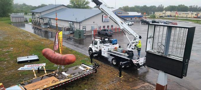 Since Indigo Signs would handle the reconstruction of the illuminated sign cabinet and the new sign poles, they approached Signs By Benchmark, a noted interior and exterior foamcore manufacturer, to handle the decorative elements. e Watertown, South Dakota-based company also found themselves eager to sculpt the oversized bratwurst and grilling fork handle out of expanded polystyrene (EPS).