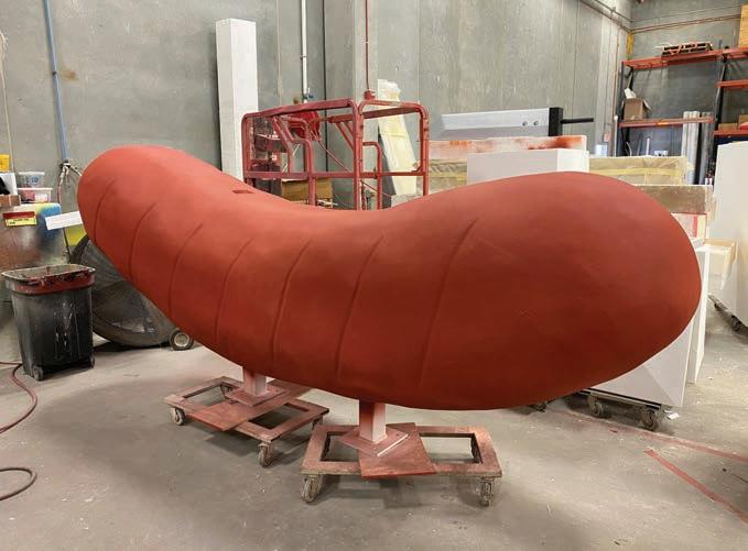 Signs By Benchmark used aged onepound-density EPS for the new sign pieces. “Since we weren’t supporting anything on top of our product, our nominal density seemed adequate for this application,” states Kakacek. e company hot wire-cut the EPS into the general shape of the bratwurst and then sculpted it further to give it a rounded look. “Cooked brats are not very smooth, so we didn’t need to focus on getting a perfectly