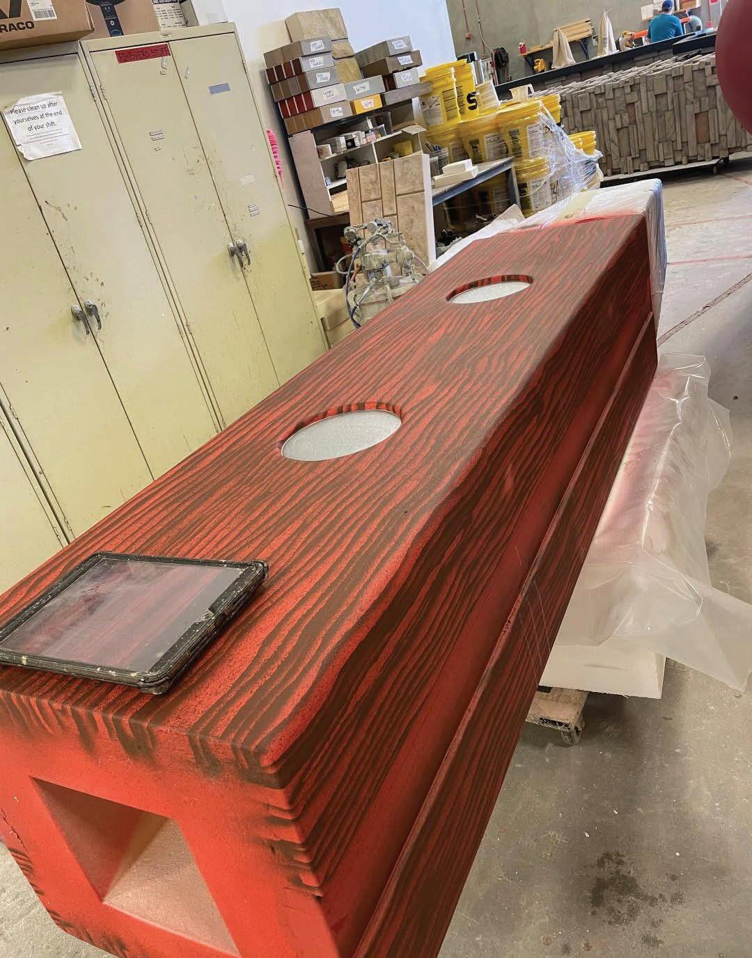 “ e grain on the wood and the colors on the bratwurst needed to blend together. Fortunately we have quite a bit of experience using water-based paints,” says Kakacek. “Upon completion, we applied a high-gloss clear coat to give the parts a bit more of a sheen, which really allowed the bratwurst to resemble fresh meat hot o the grill.”