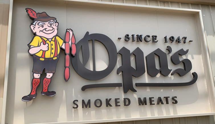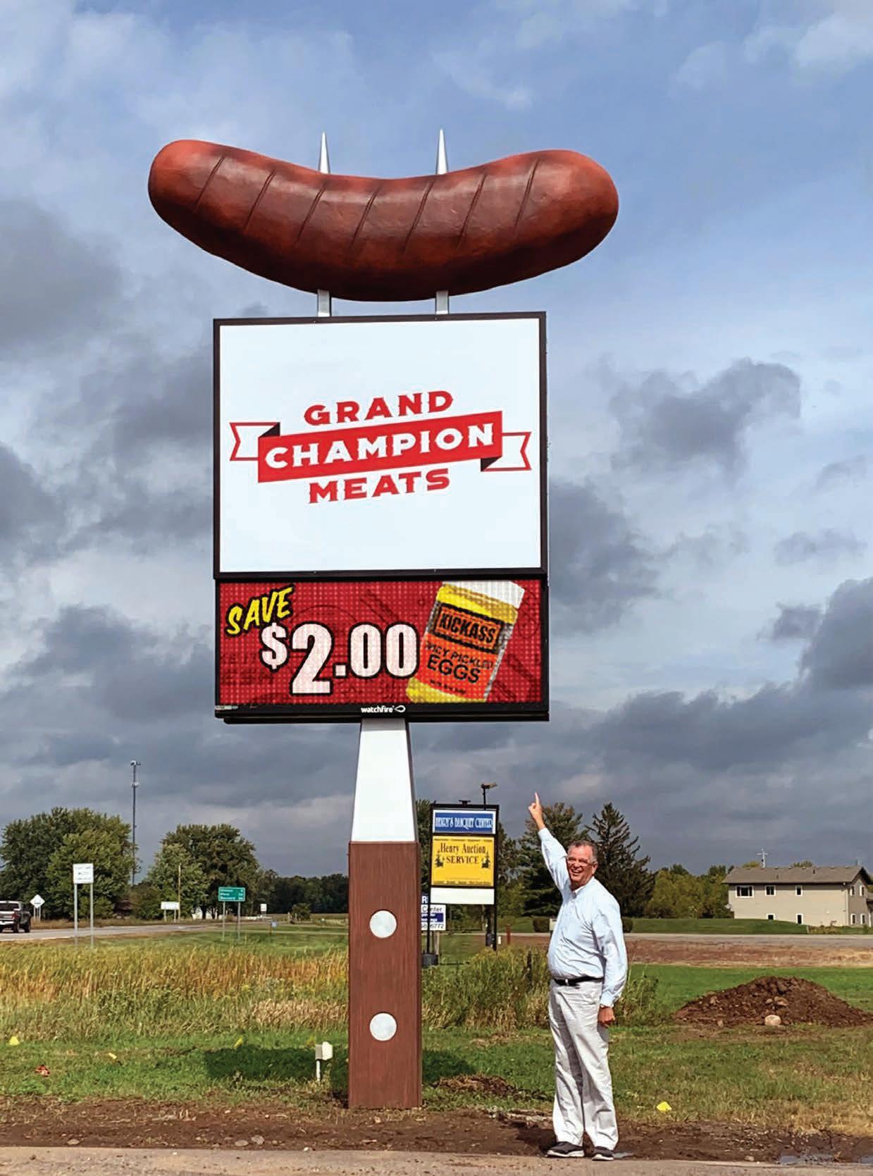 One of the biggest selling products at Grand Champion Meats is their bratwurst, so Indigo Signs decided to incorporate this into their sign rendering. ey arrived at an idea of a grilling fork handle covering the then-exposed steel pole and appearing to jut through the double-sided EMC and illuminated sign cabinet and topped with a 49-inch-tall-by-143.75-inch-wide bratwurst skewered by two grilling fork prongs.