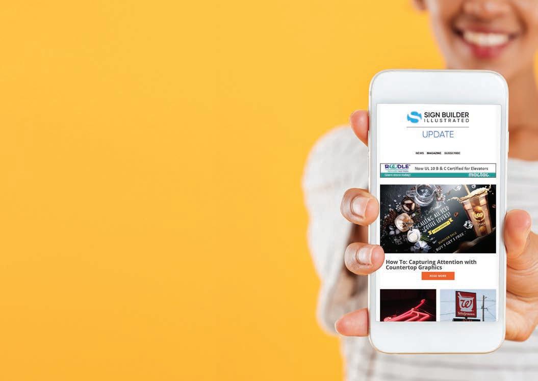 WE’VE GOT YOU COVERED Sign Builder Illustrated’s newsletters keep you up-to-date with timely news, industry trends and “how-to” articles on every aspect of the sign industry. Graphics. Dimensional. Lighting. Digital. Installation. Operations. SUBSCRIBE TO SBI NEWSLETTERS: www.signshop.com/newsletters SBI_NEWSLETTER_THIRD_SQUARE.indd 1 8/18/21 4:21 PM