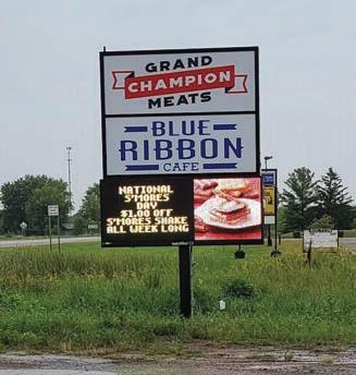 Grand Champion Meats is an award-winning, fivedecades-old meat market and butcher shop located in Foley, Minnesota. The owner had been using a single-pole-mounted LEDilluminated sign cabinet stacked atop a Watchfire electronic message center (EMC) and attached to a six-inch-round steel pipe with an existing plate grade.