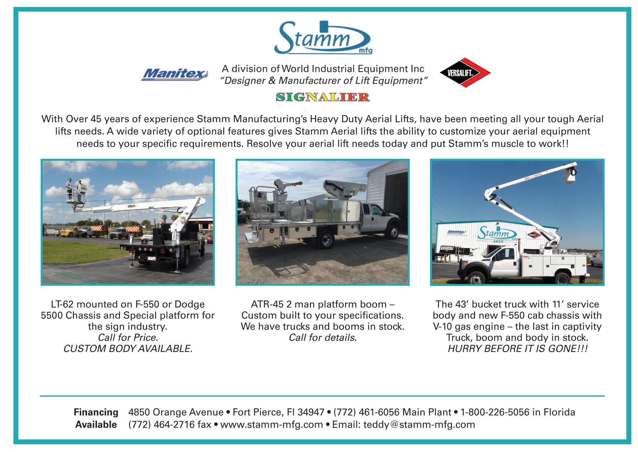 Directional sign. ATR-45N with 3’ x 5’ Aluminum Platform 1,000 lbs Material Handler. The ATR is offered in a 41, 45, 52, and 58 and all can be built on a Non-CDL truck ATR-45 2 man platform boom –Custom built to your specifications. We have trucks and booms in stock. Call for details. Stamm ATR-45N with 3’ x 5’ Aluminum Platform,1,000 lbs Material Handler Mounted on a 19,500 GVWR Isuzu. Powered by the VanAir PowerFlex unit With Over 45 years of experience Stamm Manufacturing’s Heavy Duty Aerial Lifts, have been meeting all your tough Aerial lifts needs. A wide variety of optional features gives Stamm Aerial lifts the ability to customize your aerial equipment needs to your specific requirements. Resolve your aerial lift needs today and put Stamm’s muscle to work!! 4850 Orange Avenue • Fort Pierce, Fl 34947 • (772) 461-6056 Main Plant • 1-800-226-5056 in Florida (772) 464-2716 fax • www.stamm-mfg.com • Email: teddy@stamm-mfg.com Financing Available