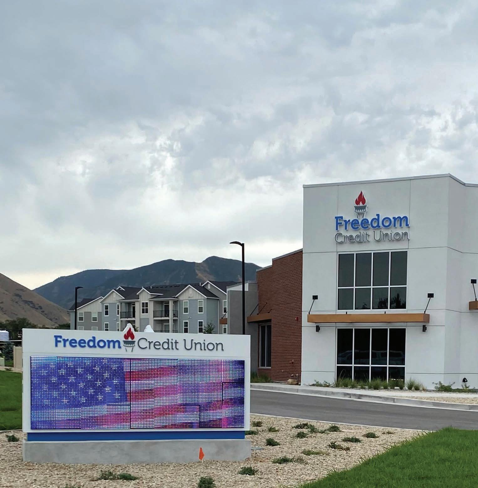 YESCO also designed and fabricated a hanging 1-foot-8-inch-tall-by-10-footwide entry sign installed off the new Freedom Credit Union building’s portico as well as a 6-foot-tall-by-6-foot-wide directional sign placed along the major street running past it.