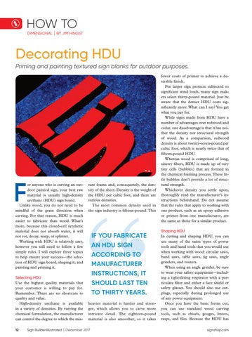 or anyone who is carving an outdoor painted sign, your best raw material is usually high-density urethane (HDU) sign board. Unlike wood, you do not need to be mindful of the grain direction when carving. For that reason, HDU is much easier to fabricate than wood. What’s more, because this closed-cell synthetic material does not absorb water, it will not rot, decay, warp, or splinter. Working with HDU is relatively easy, however you still need to follow a few simple rules. I will explore three topics to help ensure your success—the selection of HDU sign board, shaping it, and painting and priming it. Selecting HDU Use the highest quality materials that your customer is willing to pay for. Remember: There are no shortcuts to quality and value. High-density urethane is available in a variety of densities. By varying the chemical formulation, the manufacturer can control the degree to which the mix12