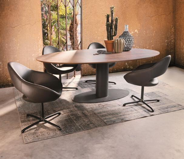 Designtisch Tube hat eine Platte aus Massiveiche und Metallfüsse in einer Lackfarbe nach Wahl. Kombinierbar mit Esszimmertisch Mr. T. Ganz nach Wunsch zu konfigurieren! Wählen Sie Gestell, Armlehne und Polsterung.