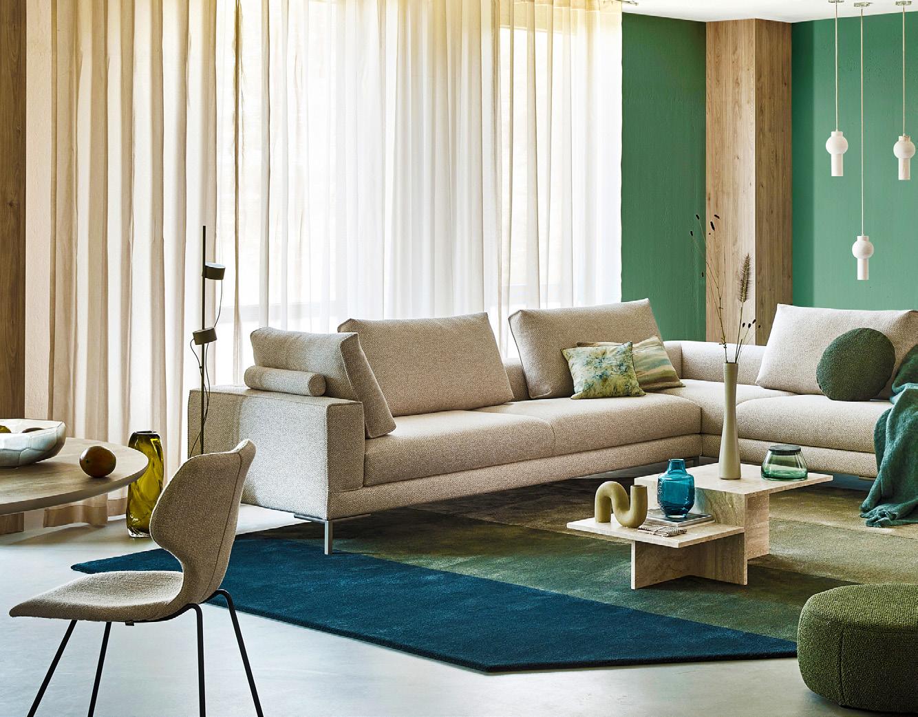 Entwurf: Beck Design (2019). Sofaprogramm mit organischen Formen. Als separates Sofa oder als Eckaufstellung, alles ist möglich. Ecksofa, wie abgebildet in Stoff Sivo von 7.110,- für 5.925,-