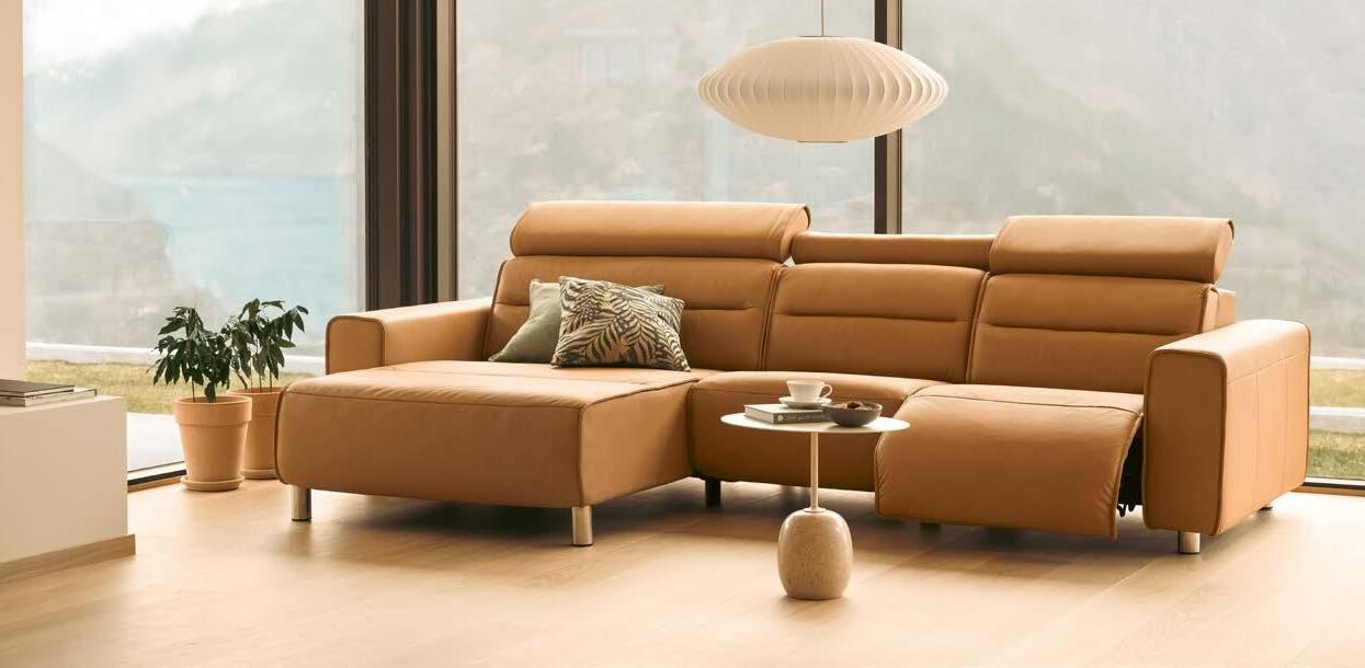 De Stressless® Emily-bank is uitgerust met de gemotoriseerde Power-functie – voor het moeiteloos verstellen van de rugleuning, hoofdsteun en voetensteun met een druk op de knop.