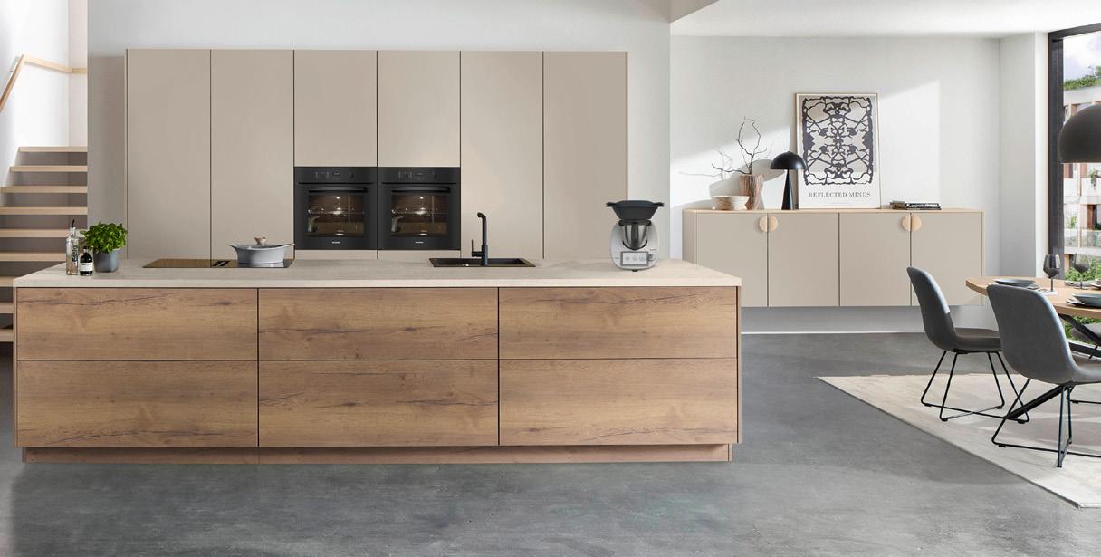 met vrijstaand kookeiland, ca. 300 / 241 x 100 cm. Front: zand, werkblad: marmer Carrara. INCLUSIEF APPARATUUR: Inbouwoven Laurus LEB10BK EEK* A, keramische kookplaat Laurus LCA600, eilandschouw zwart Airforce SharpBLF45 EEK* A, koelkast Laurus LKS88E EEK* E, design inbouwspoelbak ELLECI Logik 300 €50,korting op een aankoop Incl. levering en apparatuur: 5.495,-