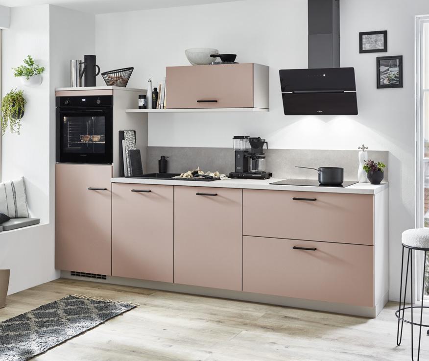 Zeilenküche ca. 280 cm, Front: Lack, Koralle Premium matt, Arbeitsplatte: Beton Sand Nachbildung