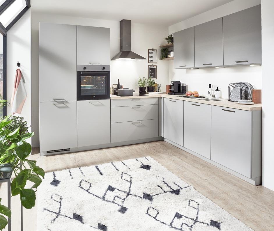 Winkelküche ca. 285 x 245 cm, Front: Lacklaminat, Steingrau supermatt, Arbeitsplatte: Eiche San Remo Nachbildung