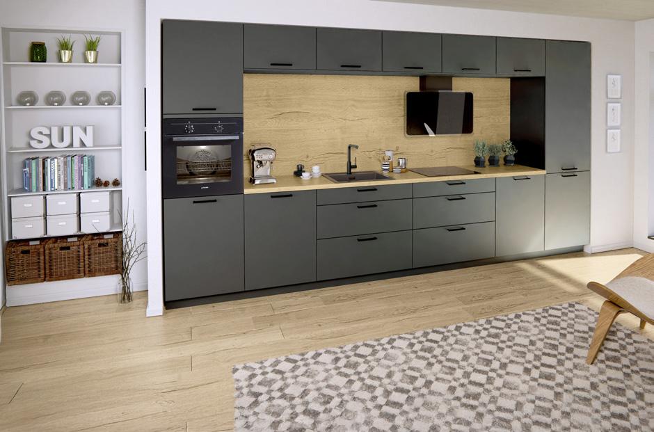 Zeilenküche ca. 420 cm, Front: Lacklaminat, Schiefergrau supermatt, Arbeitsplatte: Eiche Sierra Nachbildung INKLUSIVE GERÄTE: