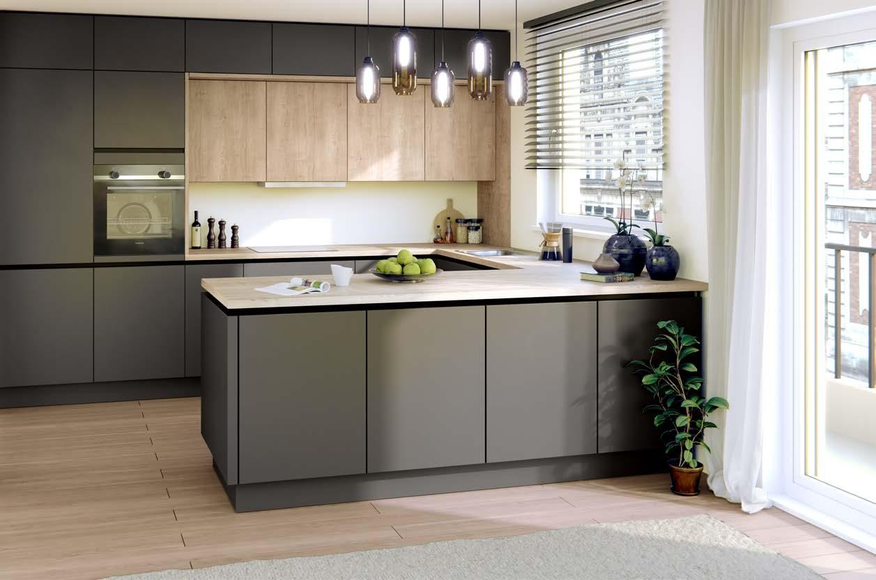 Eilandkeuken • nobilia Easytouch LineN / Structura LineN ca. 300 / 183 x 110 cm, front: laklaminaat, grafietzwart ultramat / eiken Sierra imitatie, werkblad: eiken Sierra imitatie / Venatio Nero imitatie.