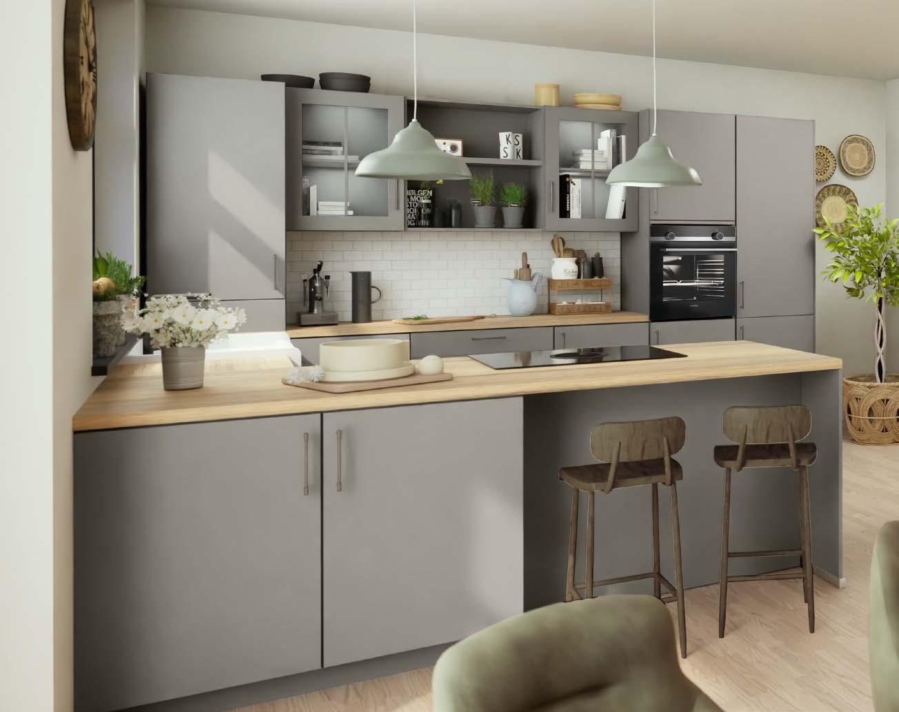 Woonkeuken • nobilia Laser ca. 245 x 305 x 387 cm, front: taupegrijs , werkblad: eiken Montreal imitatie