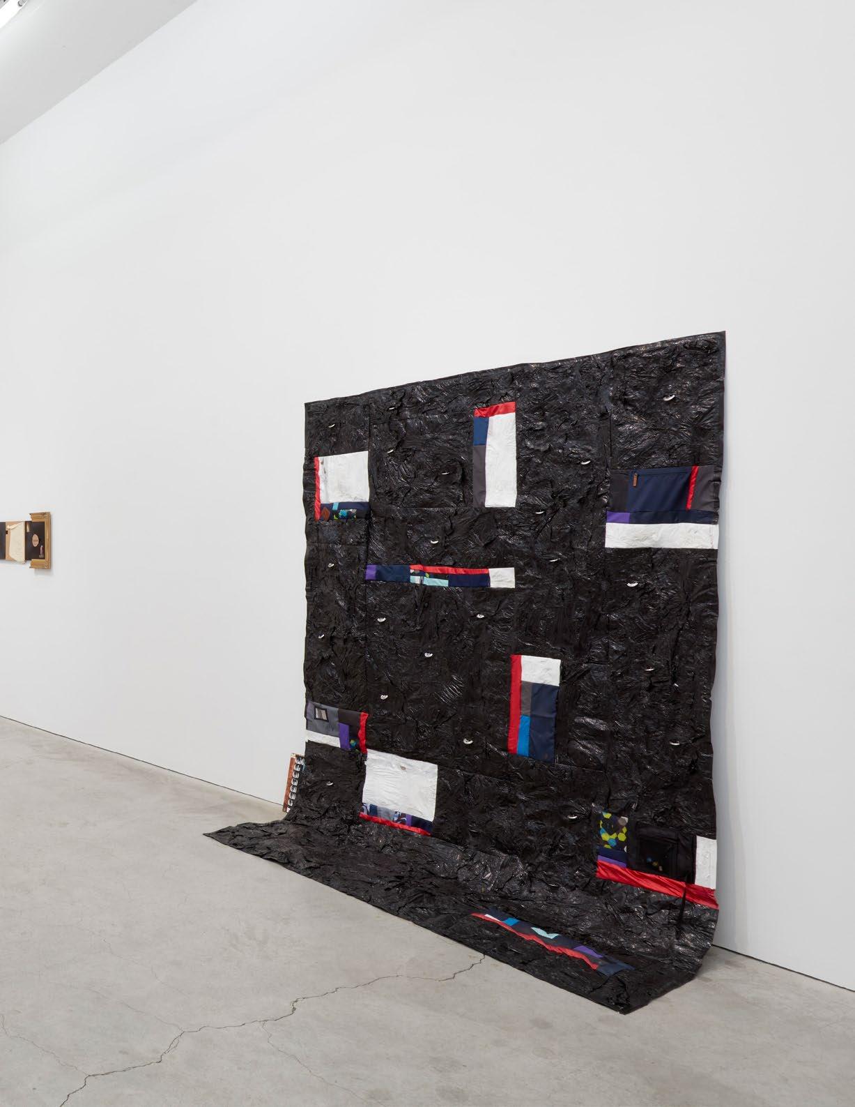 Reclaimed backpacks, tambourine jingles, plastic trash bags, duct tape fabric, paper, records, nails 77 × 103 inches (195.6 × 261.6 cm)