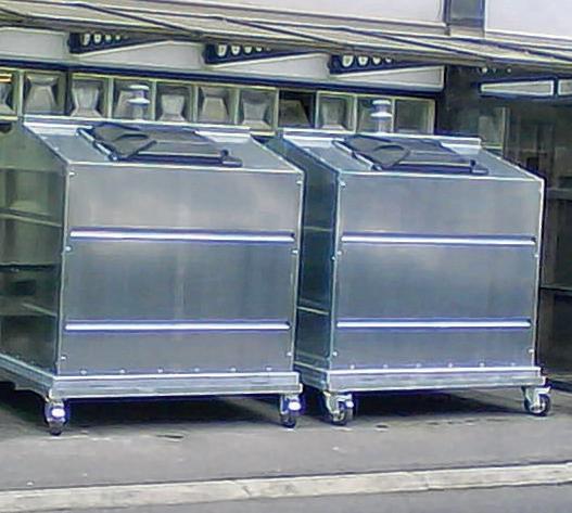 Gastro bunntømt glasscontainer er 1,5 m3, og er utstyrt med en bunnskål for oppsamling av restvæske. Skålen har en kapasitet på 80 liter. Beholderen er utstyrt med hjul, slik at den kan plasseres valgfritt - uten å måtte ta hensyn til avfallsbil.