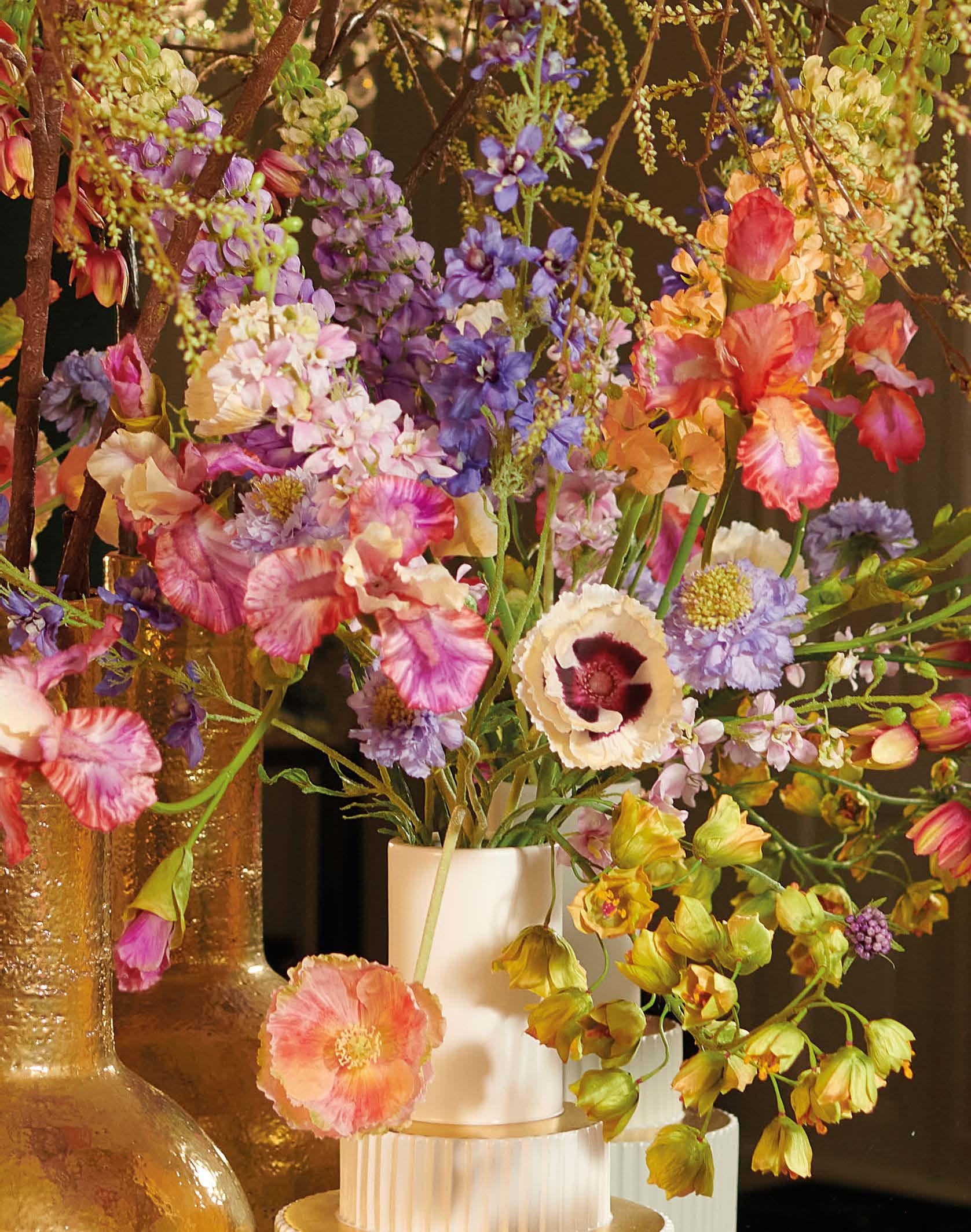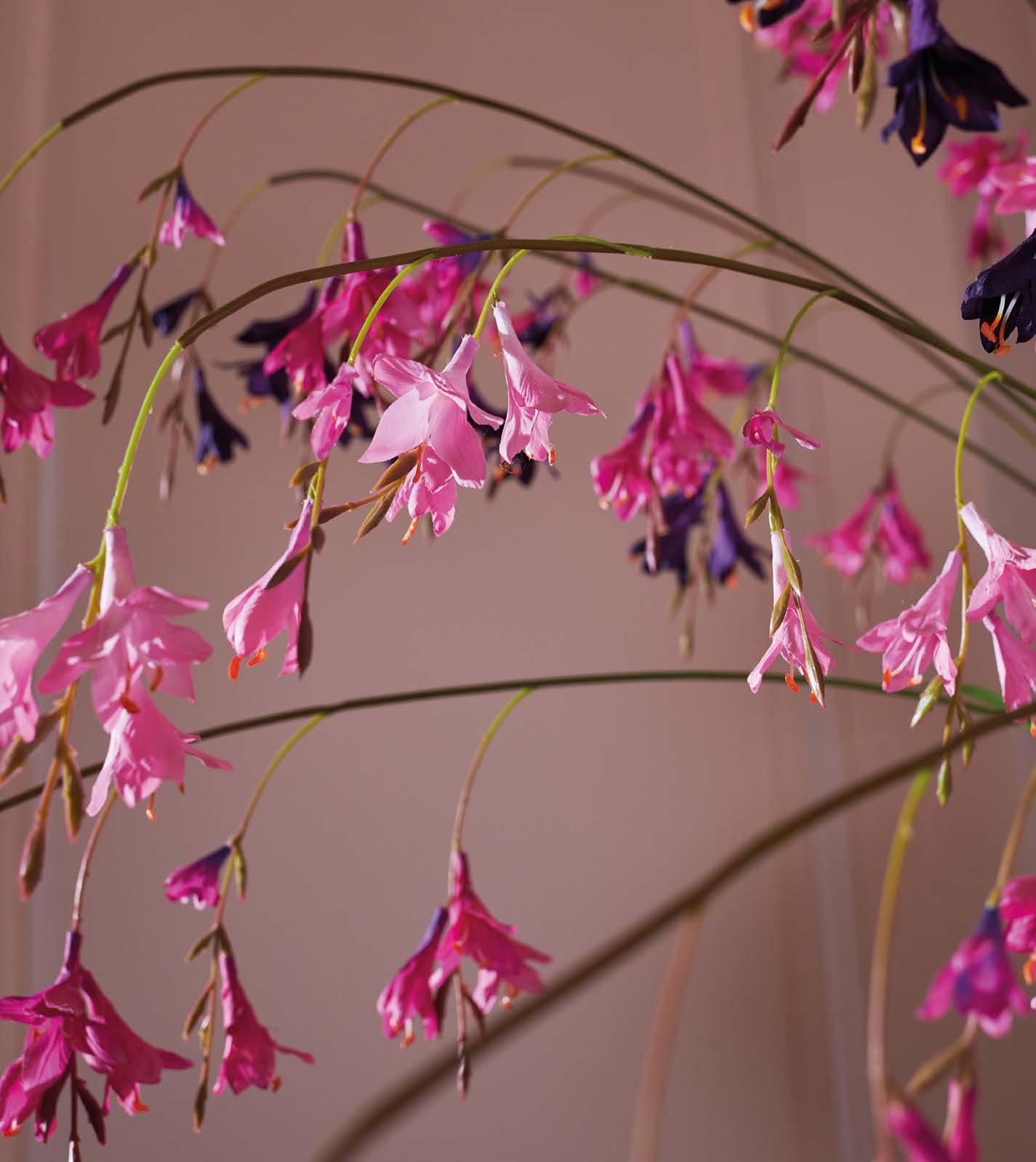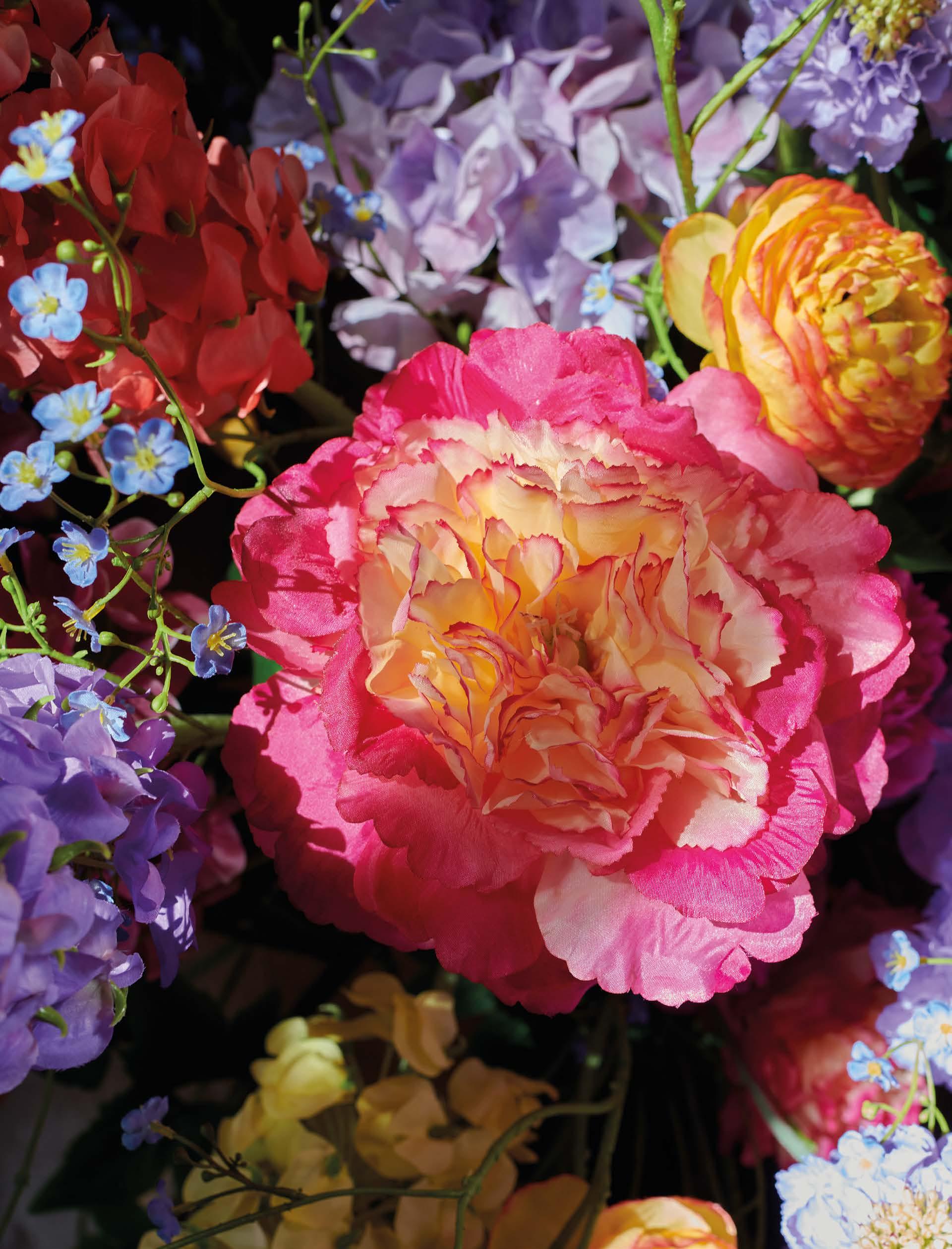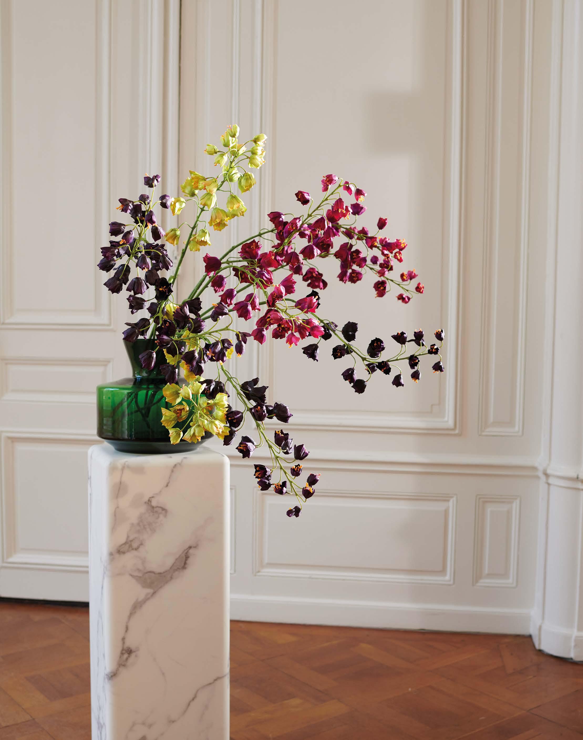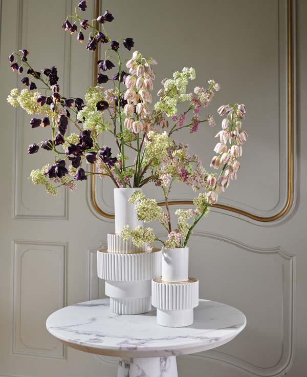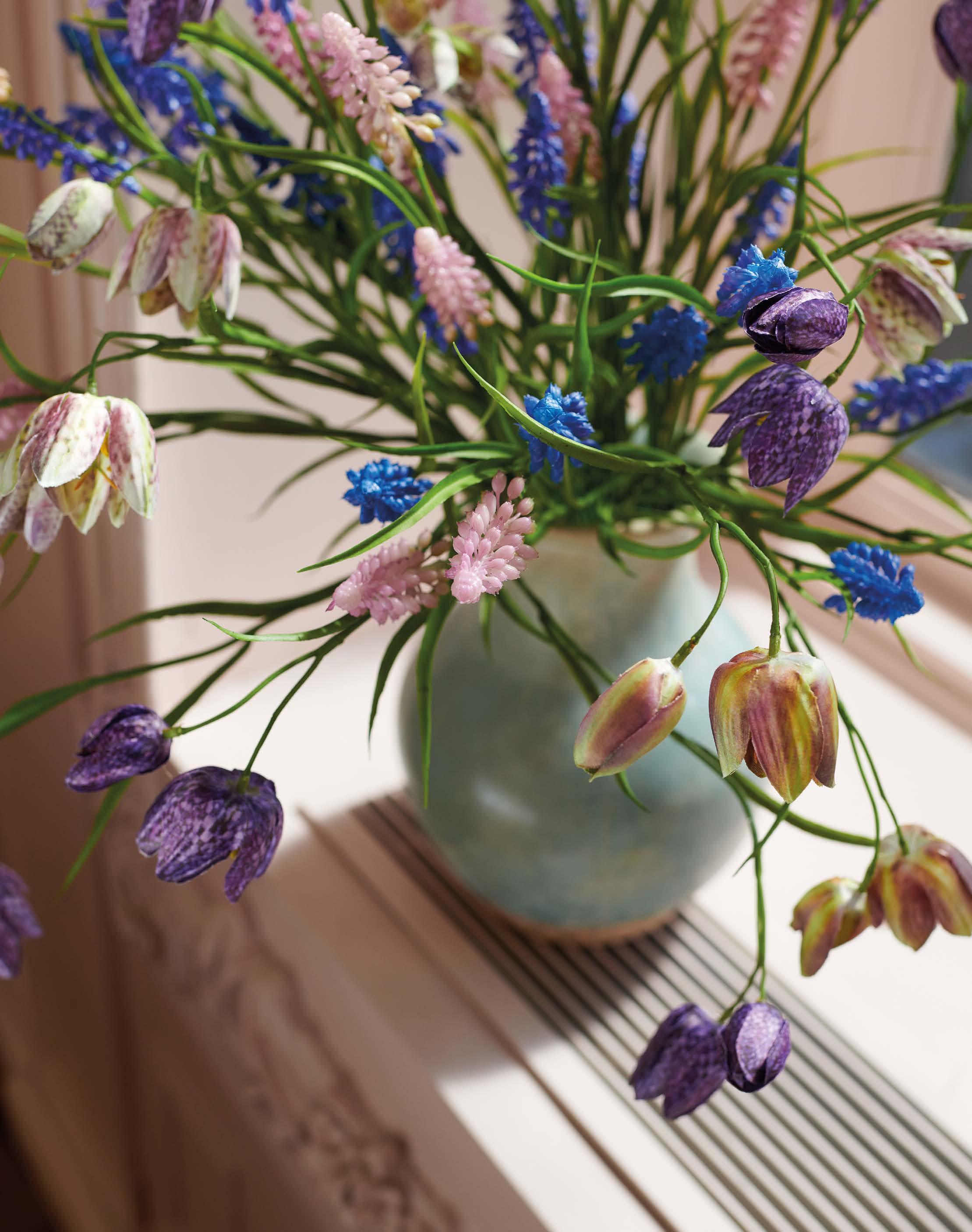 Irises with their slender stems and dramatic flowers, Fritillaria’s hung with bell shaped blooms on their strong stems and the almost geometric branches of the Statice covered in popping neon coloured flower bracts. Lifelike flowers and greenery with a bold personality to discover the limitless possibilities of your creativity.