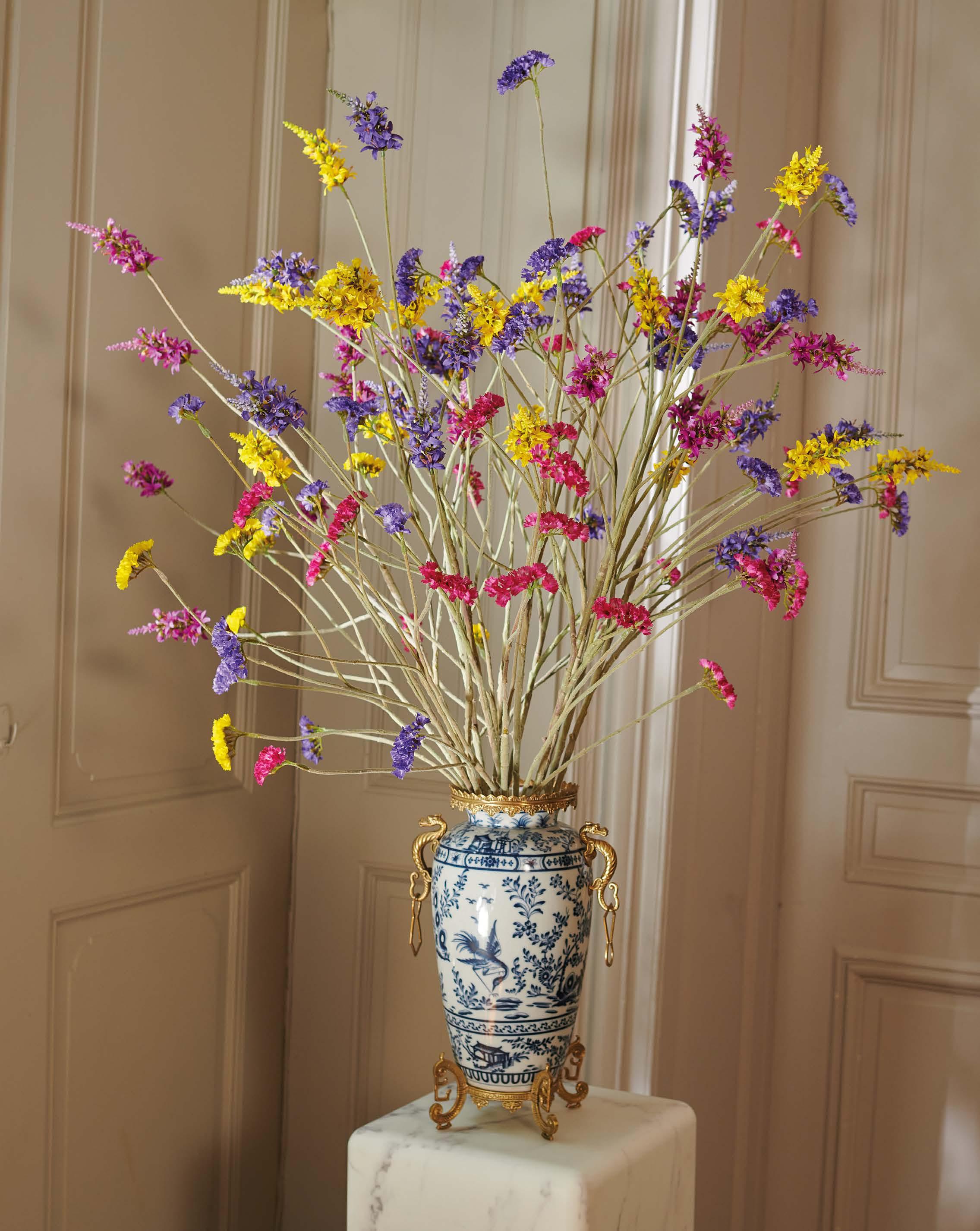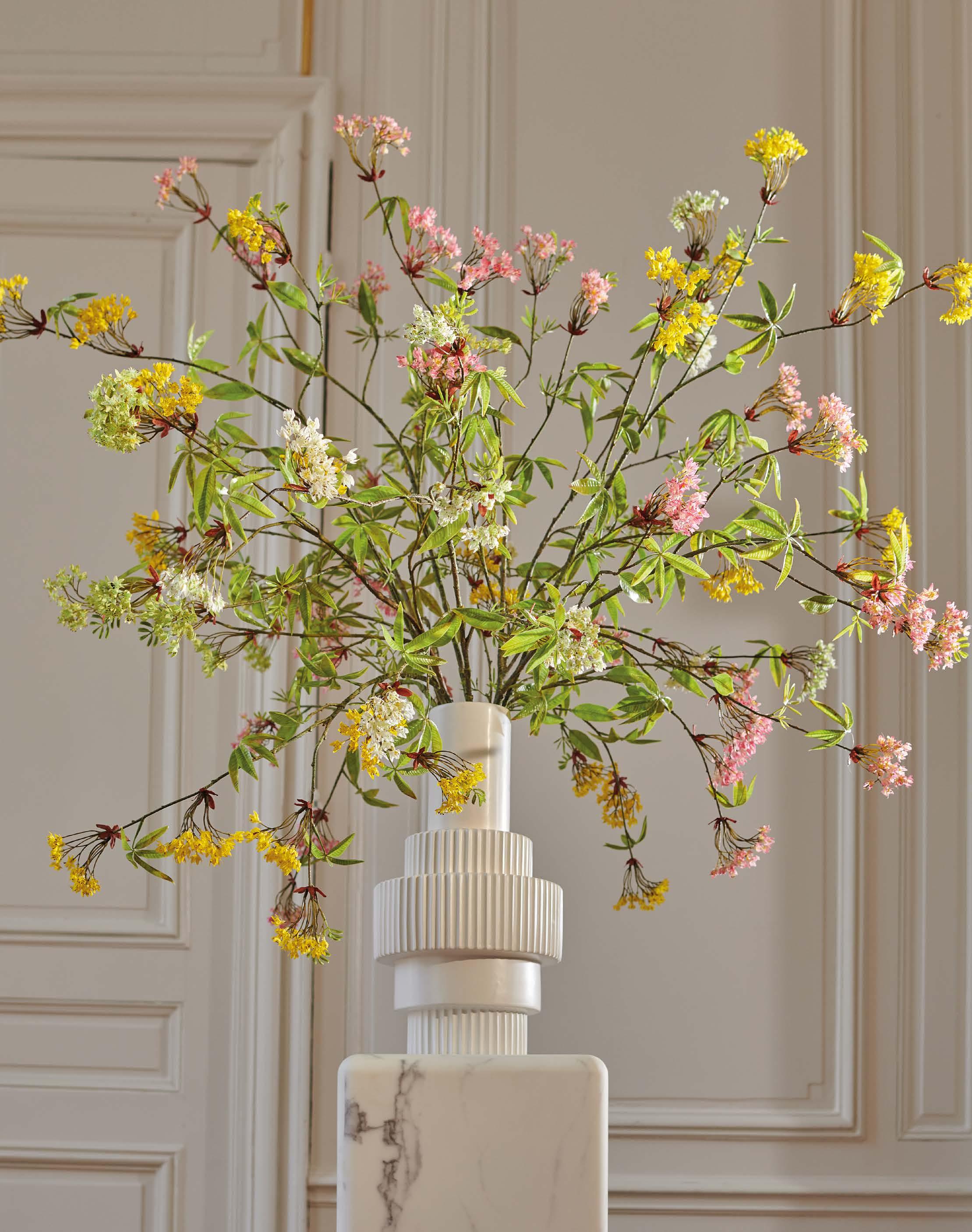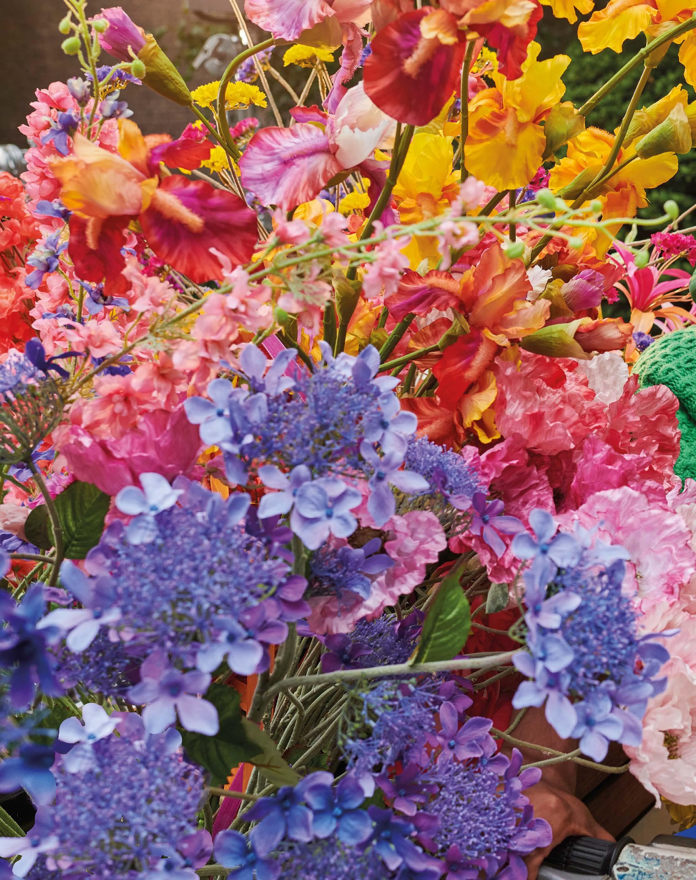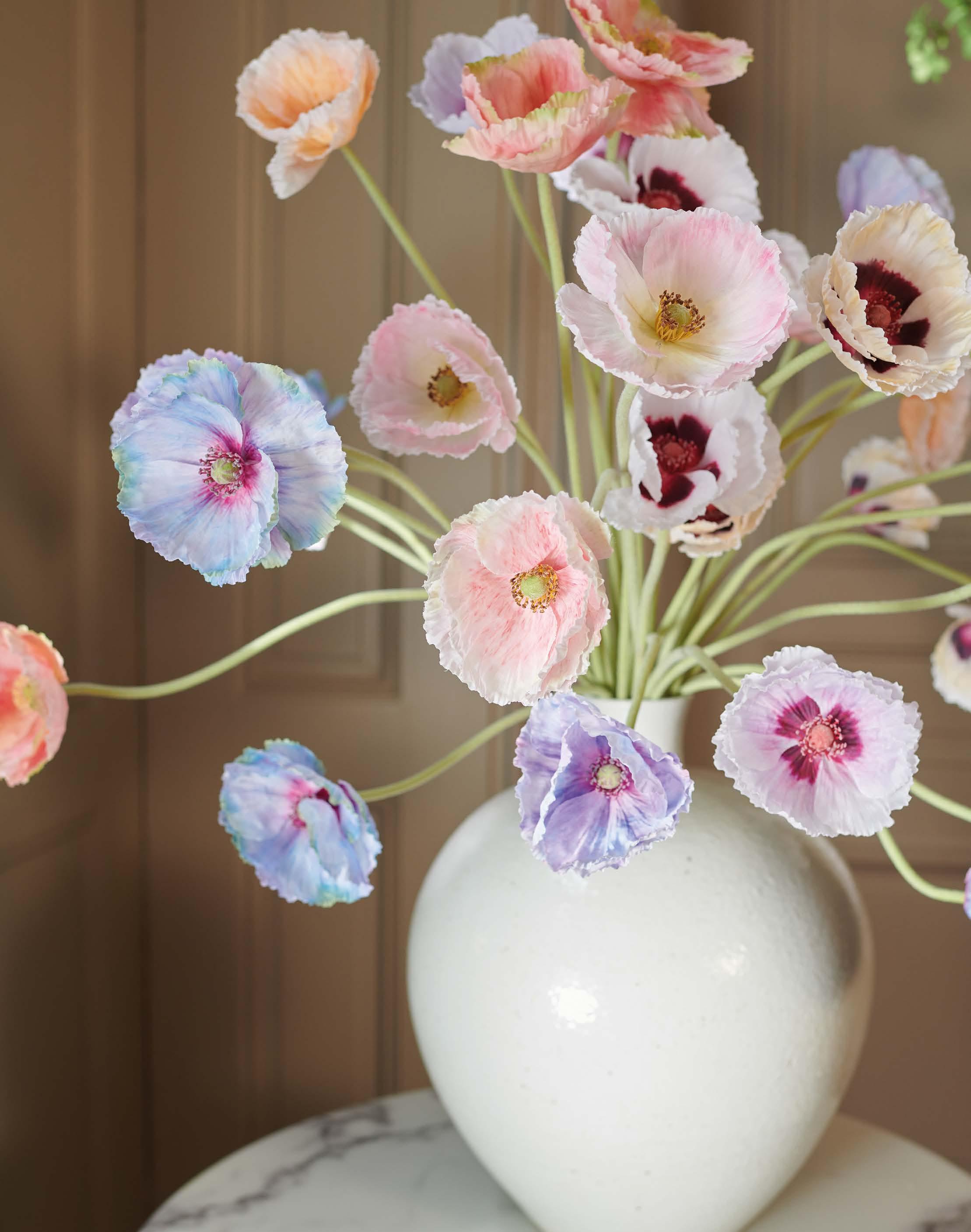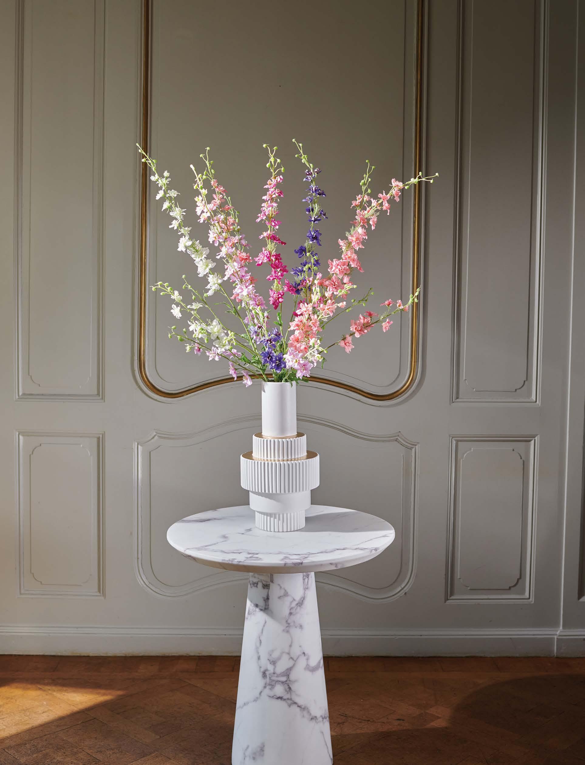Irises with their slender stems and dramatic flowers, Fritillaria’s hung with bell shaped blooms on their strong stems and the almost geometric branches of the Statice covered in popping neon coloured flower bracts. Lifelike flowers and greenery with a bold personality to discover the limitless possibilities of your creativity.