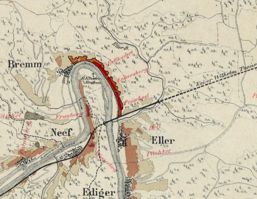 På ovenstående preussiske kort fra 1897 blev vinmarkerne markeret som mørkerøde og dermed som repræsenterende den højeste klasse i vinproduktionen i området.