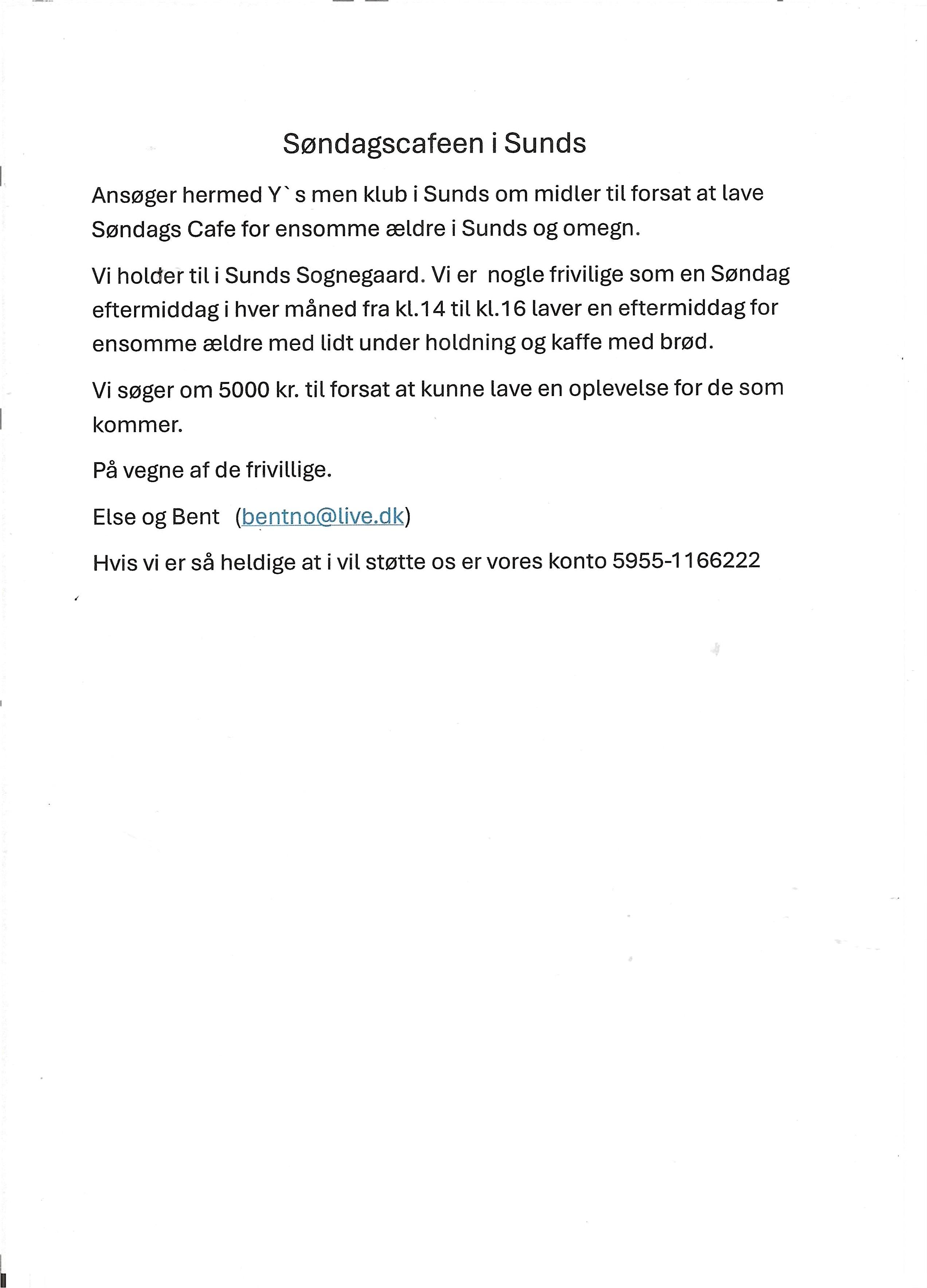 Vi tillader os hermed at ansøge Sunds Y´s Men´s Club om 10.000 kr.