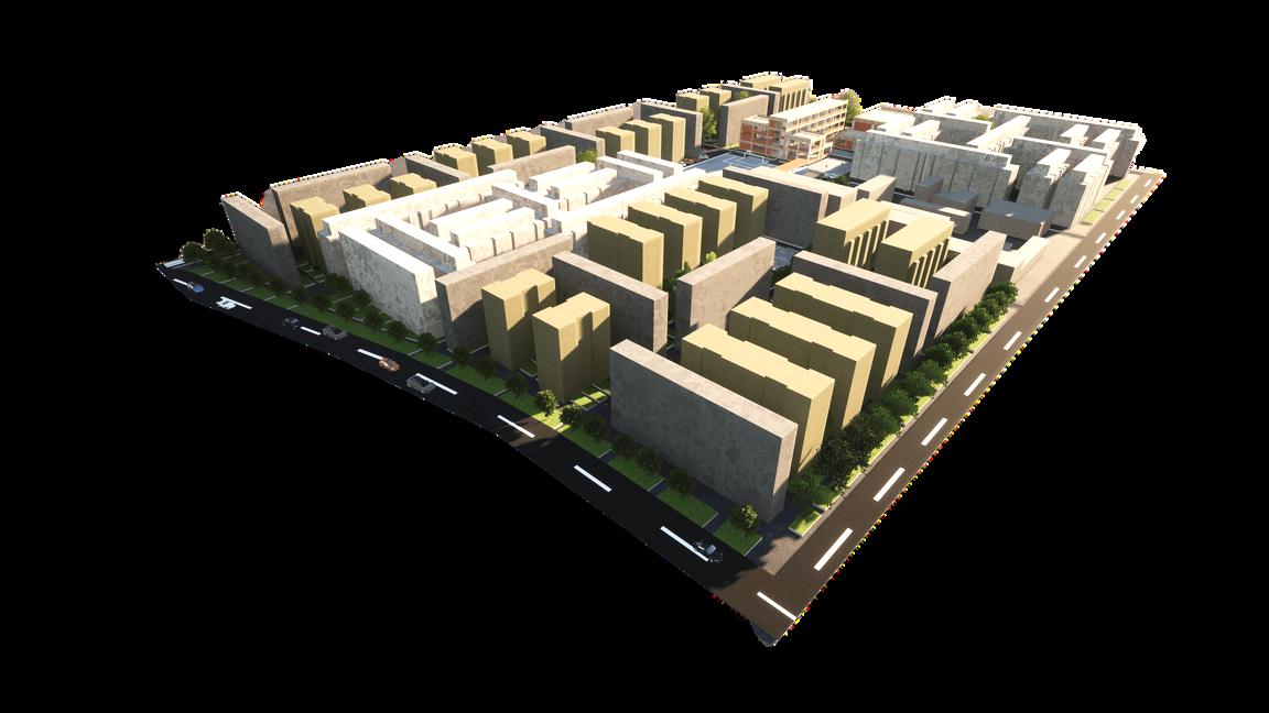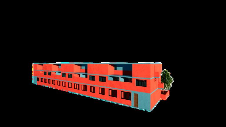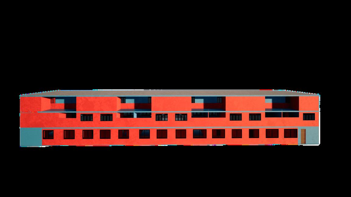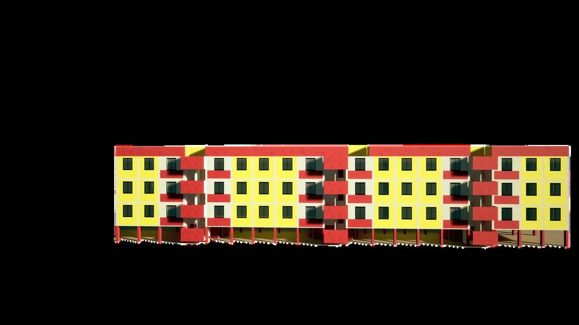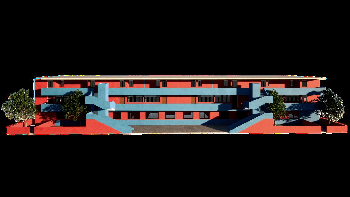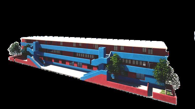 Mantiene un rango de altura de 4 pisos con una aproximación de 12m de altura, creciendo de manera vertical con 4 tipo de bloques, que jerarquizan los espacios de acuerdo a la funcionalidad.