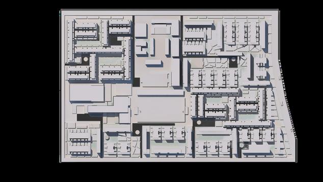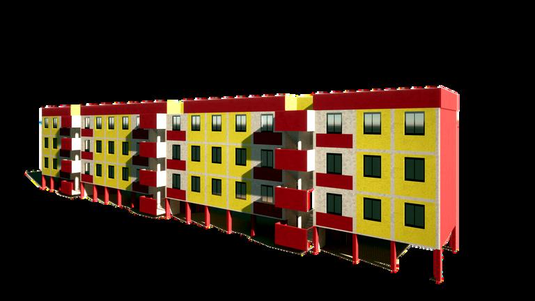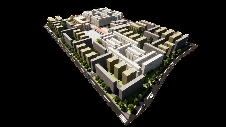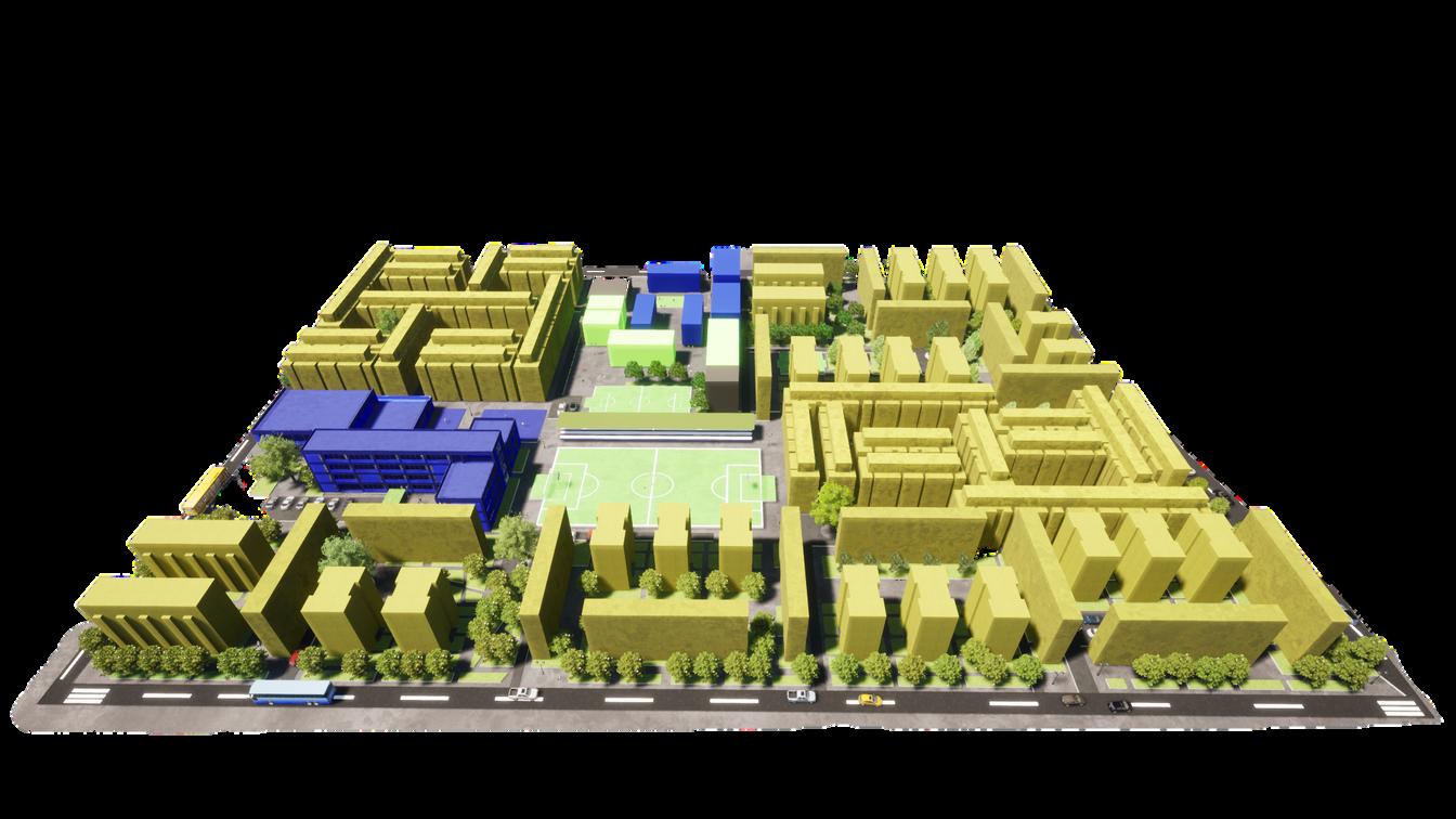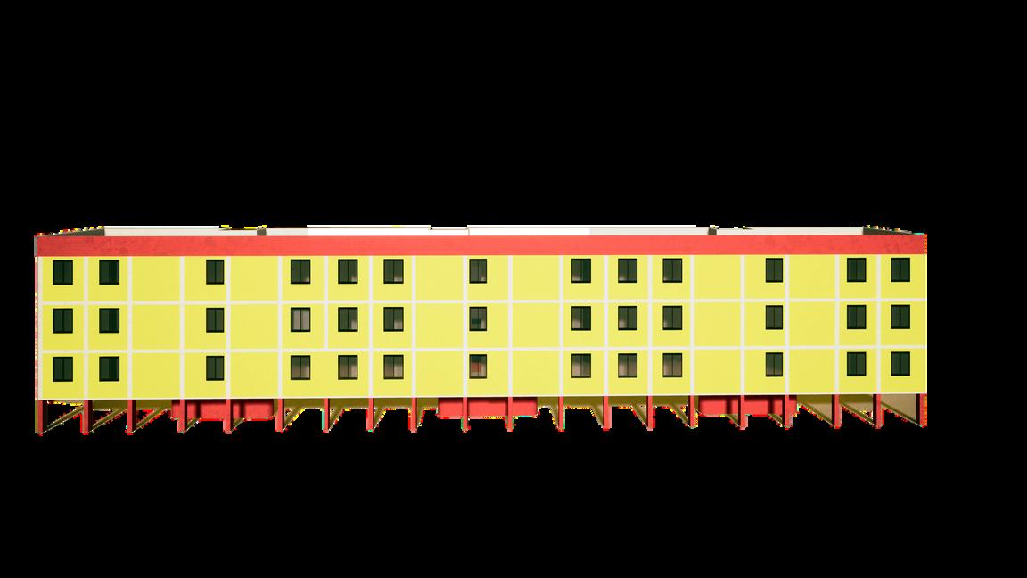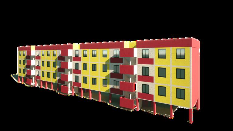 Mantiene un rango de altura de 4 pisos con una aproximación de 12m de altura, creciendo de manera vertical con 4 tipo de bloques, que jerarquizan los espacios de acuerdo a la funcionalidad.