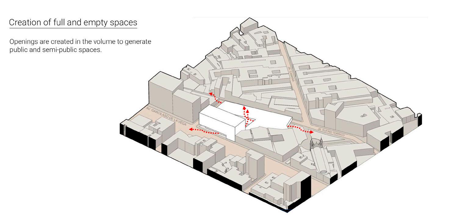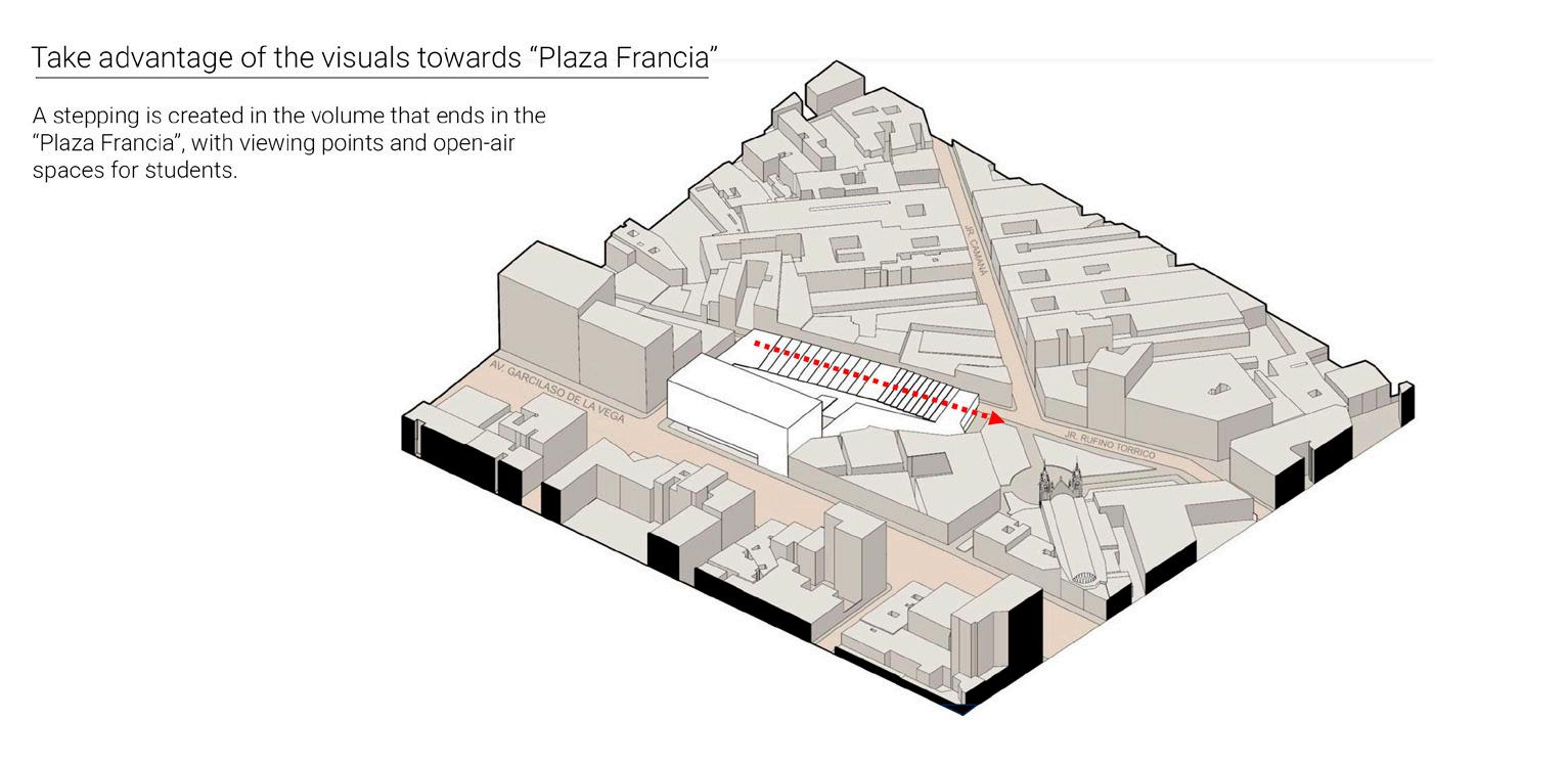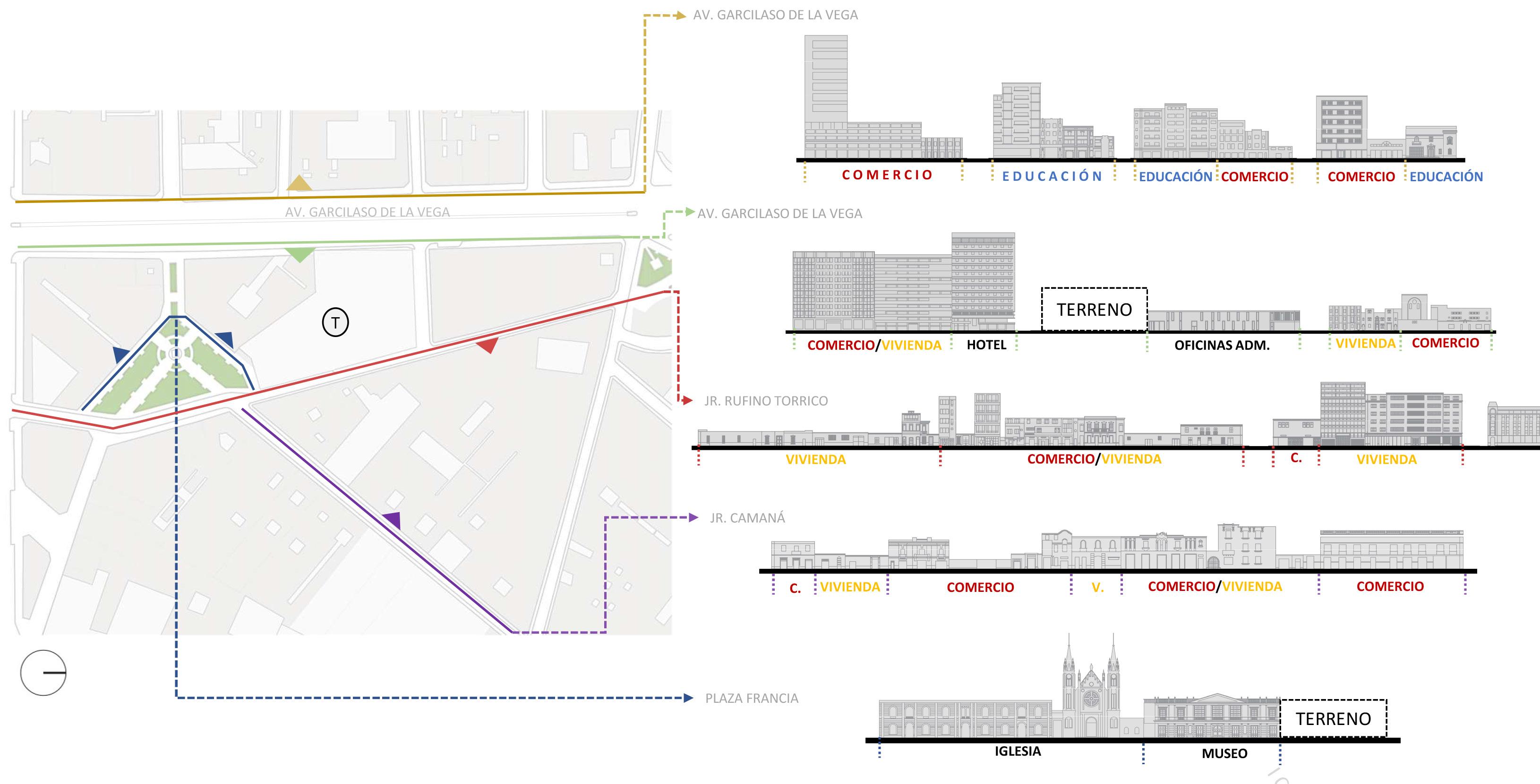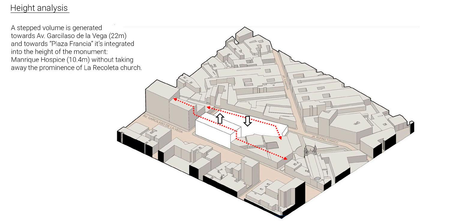 Located in the Historic Center of Lima, the terrain next to Plaza Francia (in front of Garcilaso de la Vega Avenue) was chosen. This terrain has a great potential, it’s located in a highly cultural and educational area, so it will attract different people and users. As an emphasis and a main concept, it was taken the “architecture as a scenographic space”, which represents the drama inside the theater. It was taken from the theory of the author “Peter Brook” on his book: “The empty space”. In the area, you can find various typologies (ancient and modern), so this project is like a fusion of both eras and it can be seen represented in the spatiality, materiality and the facade design. The volumetric proposal is based on a set of heights depending on the environment (the Garcilaso de la Vega Avenue is taller and Jr. Rufino Torrico’s side is shorter).