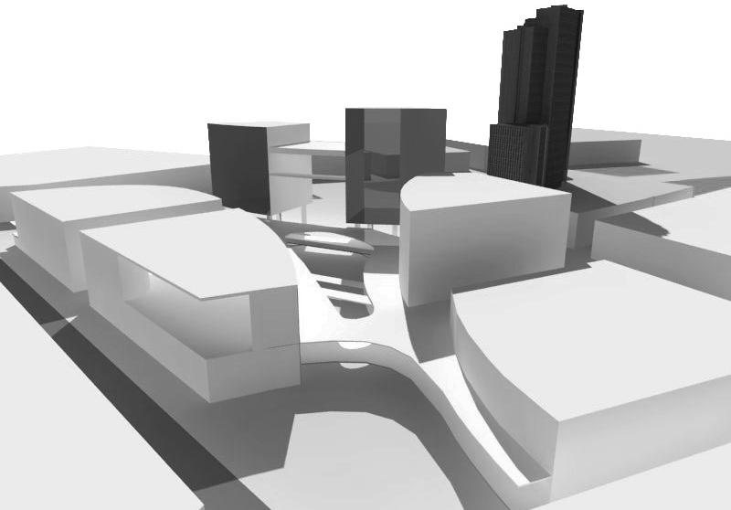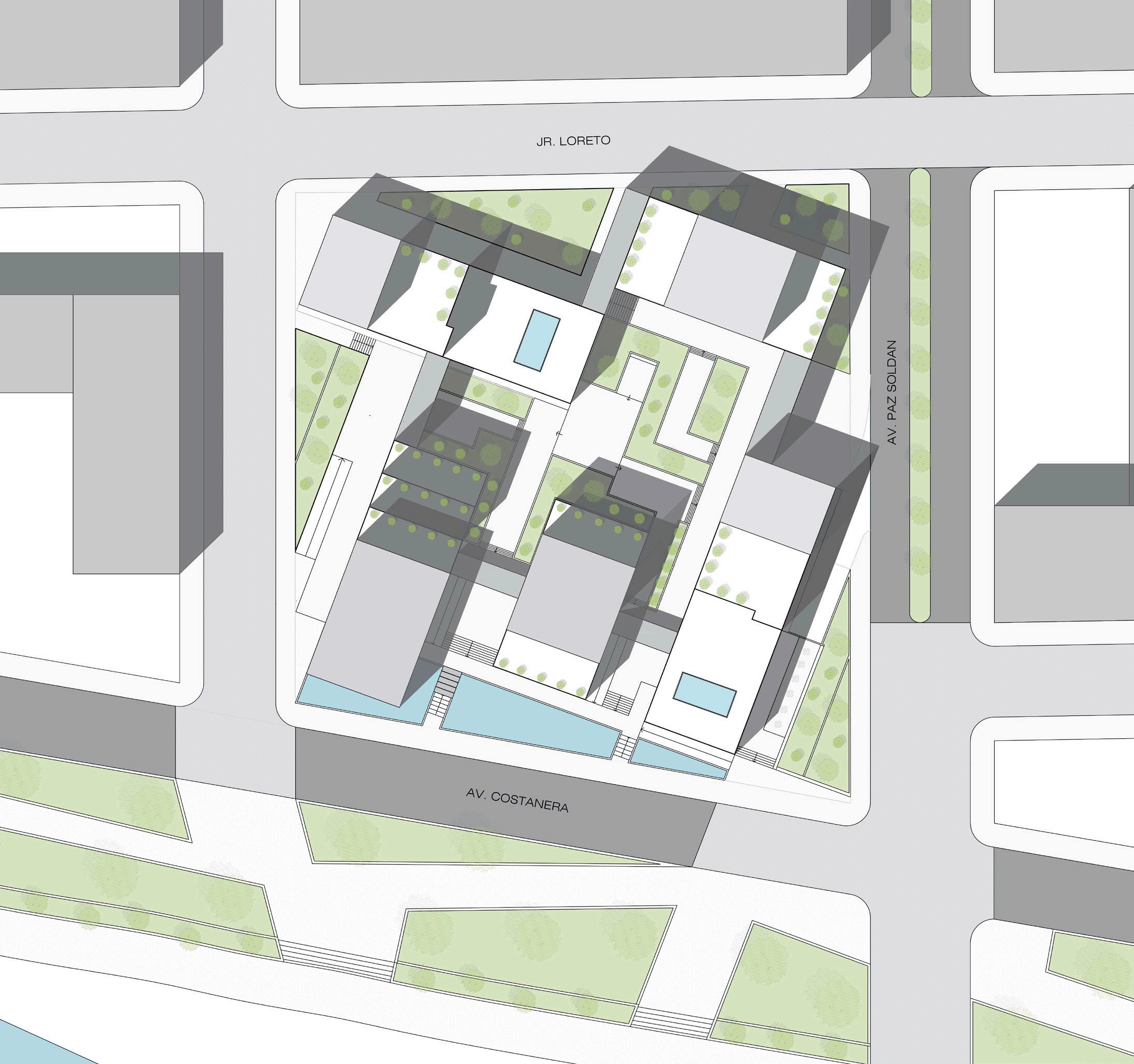 The project started from the investigation of various sectors around the Center of Lima which have high commercial potential. One of the options was the area of the Abancay Avenue, specifically in the intersection with Nicolas de Pierola Avenue. At the moment, there is a commercial gallery that operates informally, which brings social problems to it’s current architecture. Analyzing this area, it was found that there is a great commercial potential of various types. This Shopping Center will have 2 big stores and more than 30 independent stores, cinemas, food court, financial area and indoor/outdoor green areas. For the volumetric proposal, the taller towers are like a kind of “mirror” of the ex-building “Ministry of Education”, and it was based on that, a volumetric game that doesn’t break with the environment. A large public space was taken as the main proposal, which the entire program revolved around it.