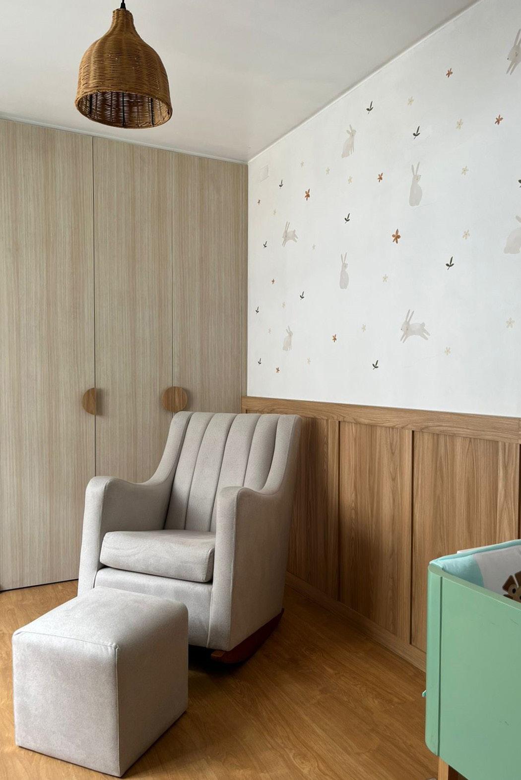 The project consisted of the remodeling a bedroom for a newborn baby. A large closet was placed, shaped shelves of “tic-tac-toe” to give dynamism to the room, and a changing table was also designed. For the design, an atmosphere that transmits tranquility for the baby, using materials such as wood and neutral colors. A one meter baseboard was placed, in order to keep the space warm, and also a decorative paper with figures.