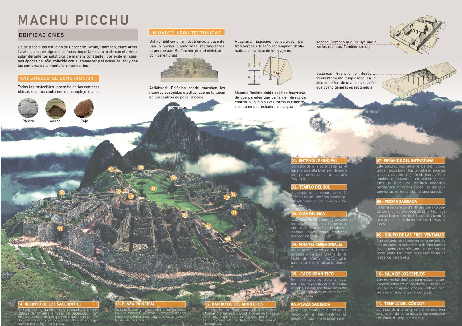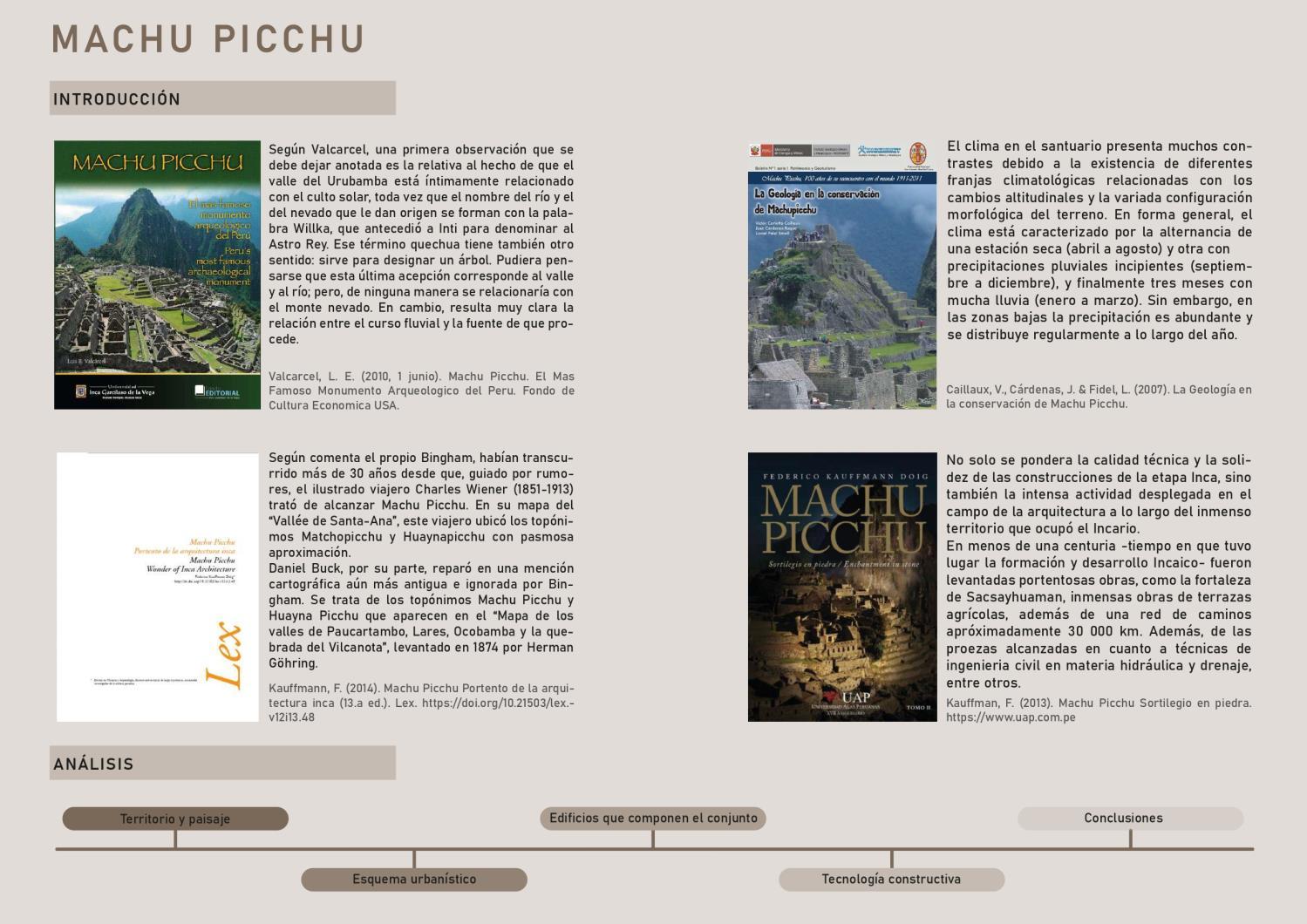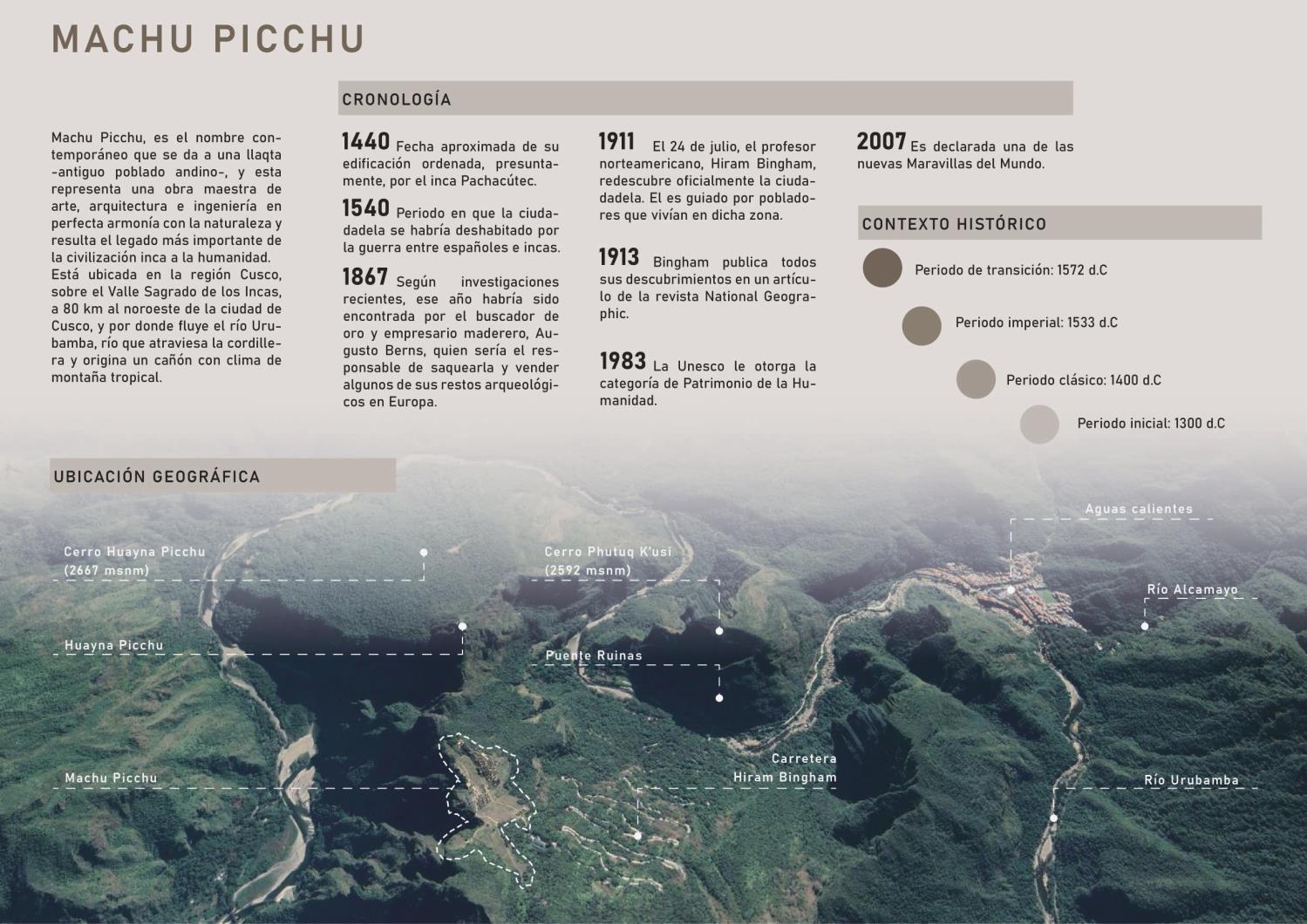 En el siguiente trabajo se realizaron infografías a cerca de Machu Picchu en donde indica un análisis del territorio y paisaje, esquema urbanístico, edificios que componen el conjunto y la tecnología constructiva empleada, además de sus textos referenciales.