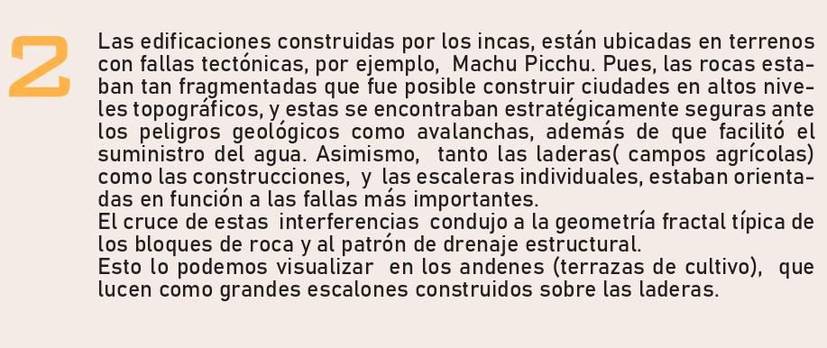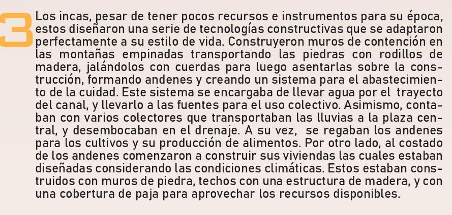 En este trabajo pude aprender como los incas construían su propio sistema de irrigación en donde con este abastecían su pueblo con agua y poder regar los cultivos, así como también las descargas de agua al río. Comprendí la manera en como construían sus viviendas a base de piedra y como ellos mismos jalaban las grandes rocas con solo rodillos de madera y cuerdas de alta resistencia para trasladarlas de un lugar a otro.