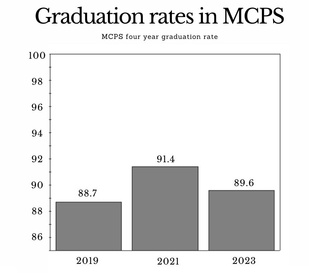 According to the Maryland State Department of Education, MCPS’ four-year graduation rate for the 2022-2023 school year was 89.6 percent. The data, released on March 26, demonstrates a slight decrease of 0.7 percentage points from the previous year, remaining 3.8 percent higher than the average graduation rate in Maryland. Over 12,000 students in Montgomery County graduated from high school in 2023.