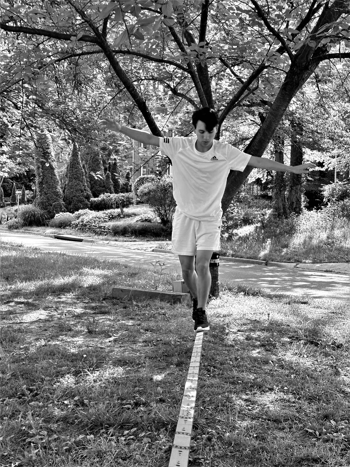 gadget contraption whatchamacallit. It’s much like a tightrope, except the band is flat instead of curved, and doesn’t come with the long bar that tightrope walkers use to balance. The sport’s popular among eight-year-old children and thirty-year-old men alike. In preparation for my golden years, I’ll be learning the technique now. When the slackline arrived in the mail, I was eager to burn rubber. Having a thirst for danger and to not go far from my house at night, I set it up on my front walk. Below my feet to one side was the comfort of the concrete, on the...
