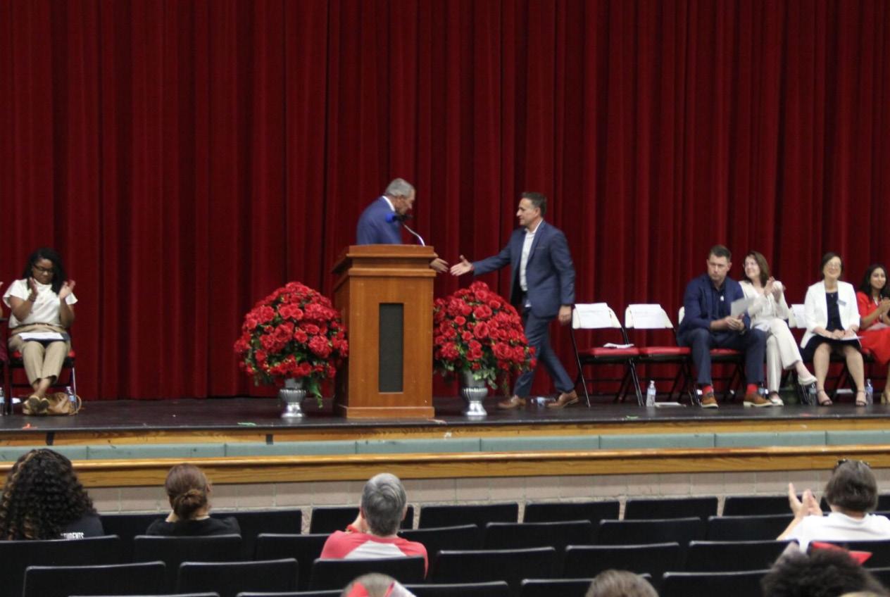 In his opening statement, Principal Damon Monteleone highlighted the culture and diversity that he had seen in his first term at Blair. Next, Mark Levin, president of the Blair Alumni Association, spoke about the history of the school and its notable alumni. Levin also invited the audience to explore the various exhibits the Alumni Association had created, including a plaque in the media center honoring former Blair students who served in wars like World War 2 and the Vietnam War. He then spoke about the plaques hung around the auditorium spotlighting
