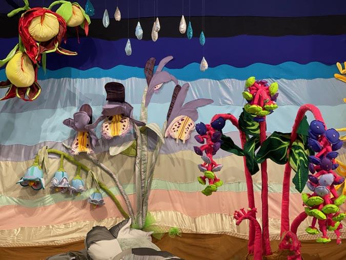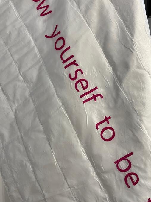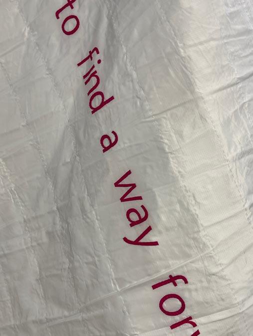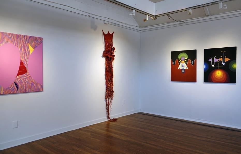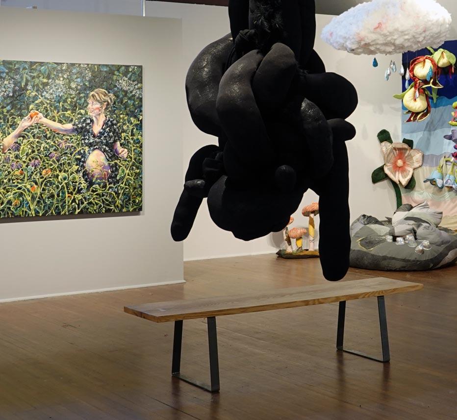 Queer art can imagine new relationships to the the world. Juls Gabs expands painting into digital space, animating her classically-inspired figures through an augmented reality app. Libby Paloma crafts a nearly hallucinatory forest of stuffed plants, trees, and mushrooms, a self-described "love letter" to healing botanicals. But all works in this exhibition, taken together, underscore the position that artmaking from an LGBTQIA+ perspective is ultimately a kind of wayfinding. In a terrifyingly reactionary moment of mounting human rights violations in the US through violence and legislation, queer and trans people look back on their history to build solidarity for livable futures. In the works on artist Emily Yurkevicz's flag, "to follow yourself back/to