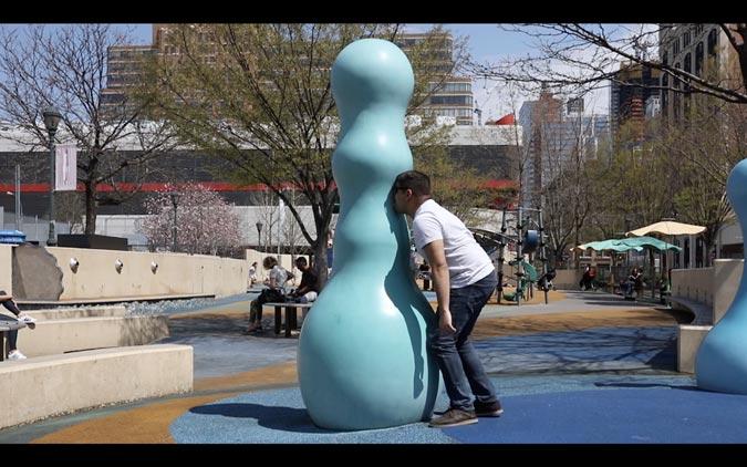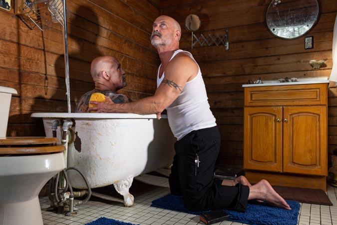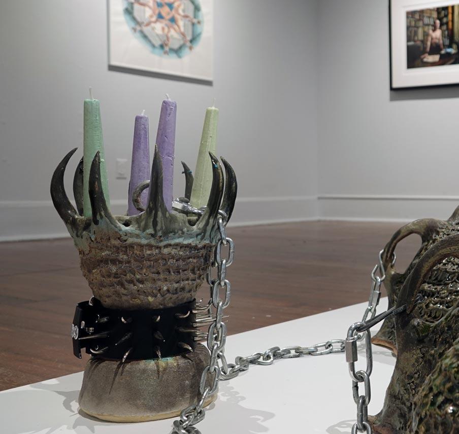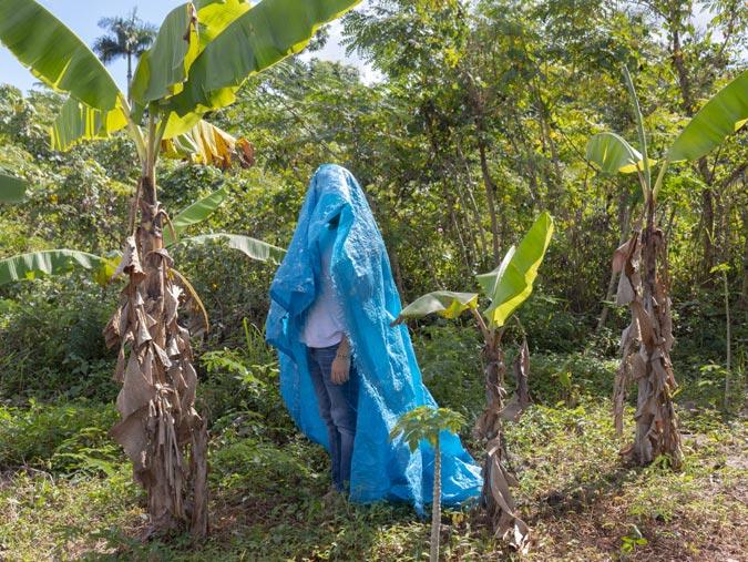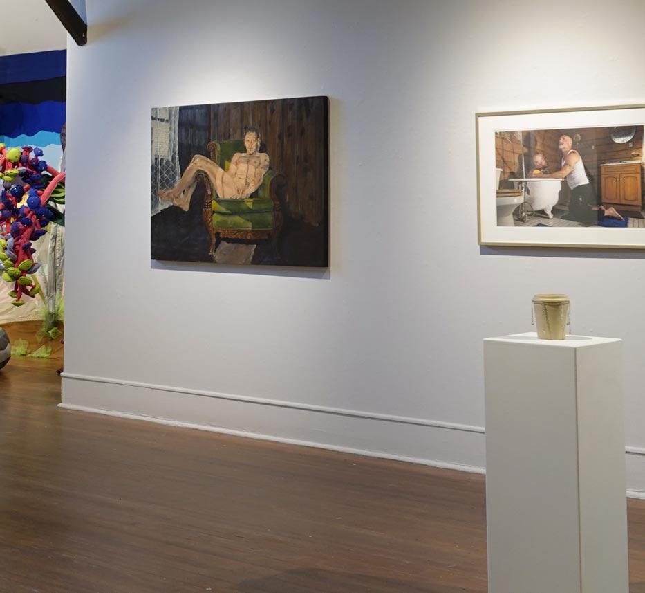 Queer art can affirm ways of being and belonging in spaces of precarity and risk. Several artists turn the camera onto themselves and their chosen kin, deploying photography's documentary capacities, historically so often wielded against marginalized communities. K Sarrantonio's installations of silkscreened tiles with tender photographic images of nonbinary gestational parenting underscore the necessity of collective care. Kevin Quiles Bonilla depicts himself draped in the blue tarp ubiquitous in post-hurricane Puerto Rico—deceptively simple self-portraits that subtly critique the absurdity and violence of colonialism.